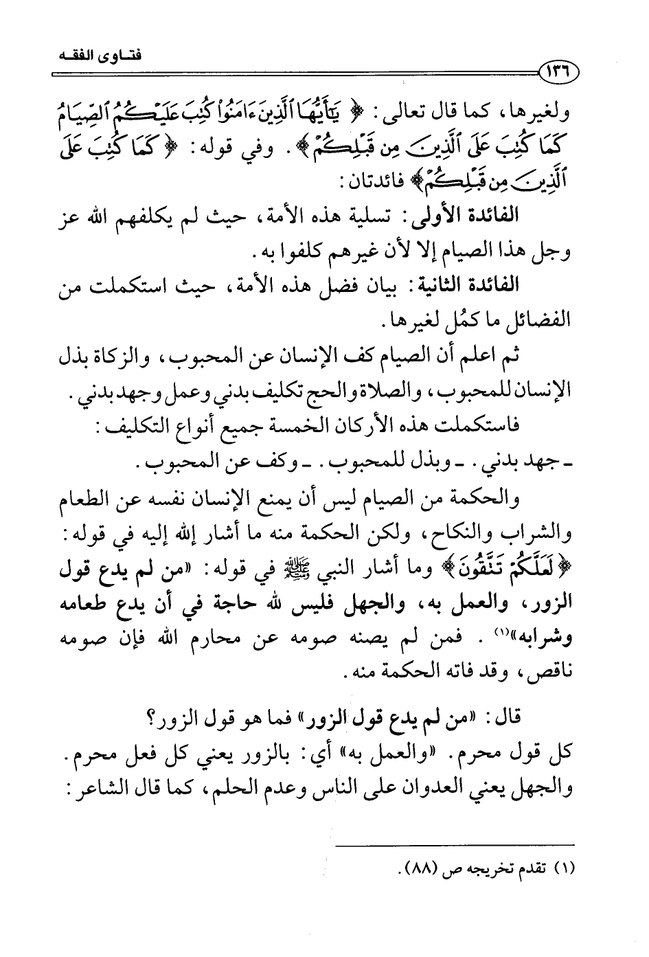 والحكمة من الصيام ليس أن يمنع الإنسان نفسه عن الطعام والشراب والنكاح، ولكن الحكمة منه ما أشار إلله إليه في قوله: {لَعَلَّكُمْ تَتَّقُونَ} وما أشار النبي صَلَّى اللَّهُ عَلَيْهِ وَسَلَّمَ في قوله: «من لم يدع قول الزور، والعمل به، والجهل فليس لله حاجة في أن يدع طعامه وشرابه» . فمن لم يصنه صومه عن محارم الله فإن صومه ناقص، وقد فاته الحكمة منه.