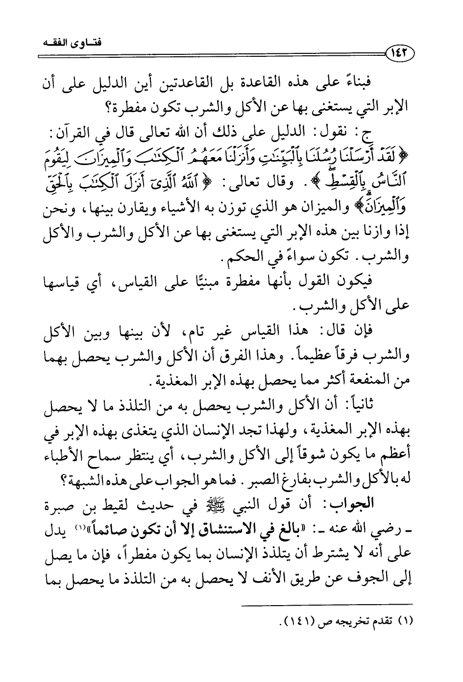 ج: نقول: الدليل على ذلك أن الله تعالى قال في القرآن: {لَقَدْ أَرْسَلْنَا رُسُلَنَا بِالْبَيِّنَاتِ وَأَنزَلْنَا مَعَهُمُ الْكِتَابَ وَالْمِيزَانَ لِيَقُومَ النَّاسُ بِالْقِسْطِ وَأَنزْلْنَا الْحَدِيدَ فِيهِ بَأْسٌ شَدِيدٌ وَمَنَافِعُ لِلنَّاسِ وَلِيَعْلَمَ اللهُ مَن يَنصُرُهُ وَرُسُلَهُ بِالْغَيْبِ إِنَّ اللهَ قَوِىٌّ عَزِيزٌ} . وقال تعالى: {اللهُ الَّذِى" أَنزَلَ الْكِتَابَ بِالْحَقِّ وَالْمِيزَانَ وَمَا يُدْرِيكَ لَعَلَّ السَّاعَةَ قَرِيبٌ} والميزان هو الذي توزن به الأشياء ويقارن بينها، ونحن إذا وازنا بين هذه الإبر التي يستغنى بها عن الأكل والشرب والأكل والشرب. تكون سواءً في الحكم.