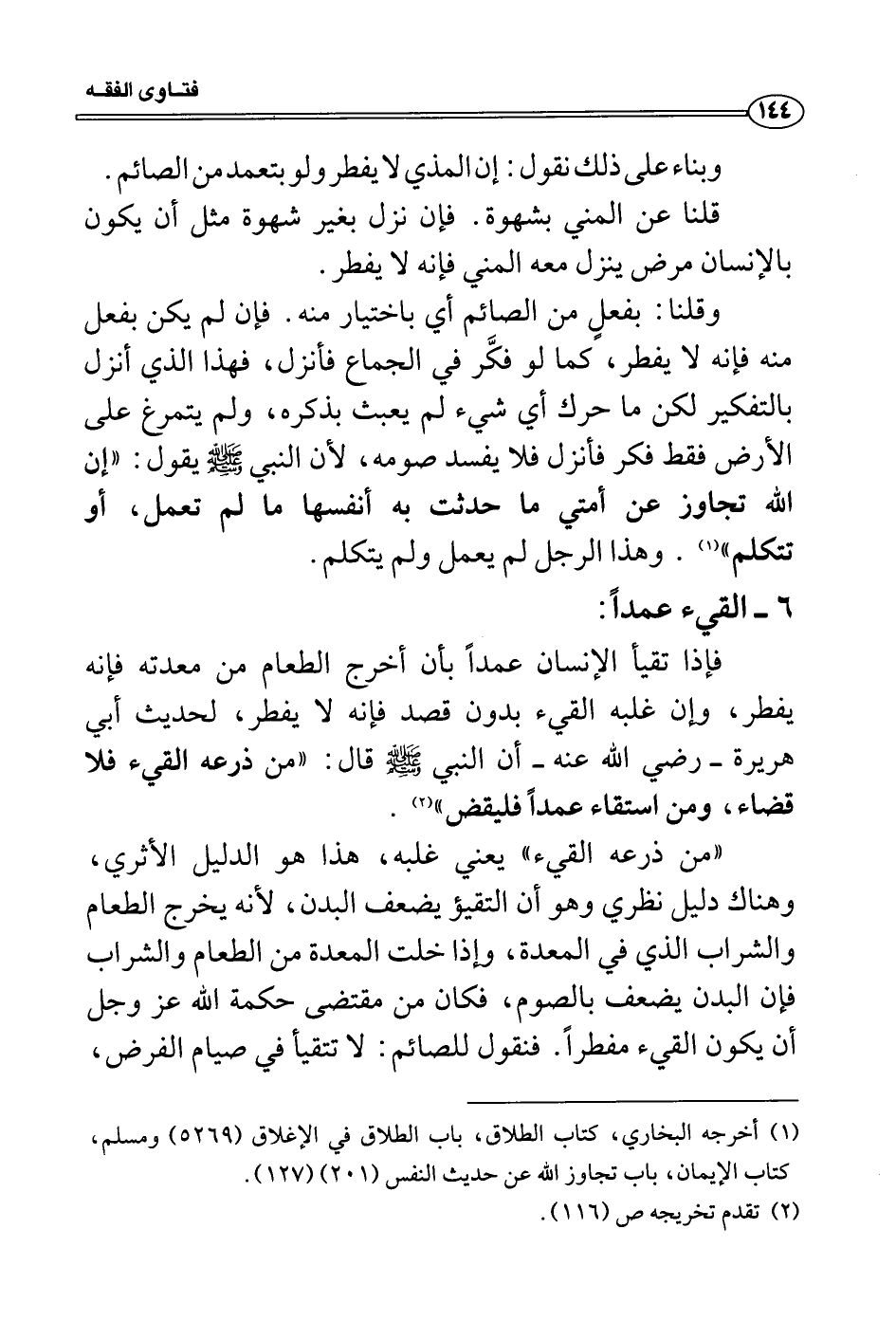 فإذا تقيأ الإنسان عمداً بأن أخرج الطعام من معدته فإنه يفطر، وإن غلبه القيء بدون قصد فإنه لا يفطر، لحديث أبي هريرة رضي الله عنه أن النبي صَلَّى اللَّهُ عَلَيْهِ وَسَلَّمَ قال: «من ذرعه القيء فلا قضاء، ومن استقاء عمداً فليقض» .