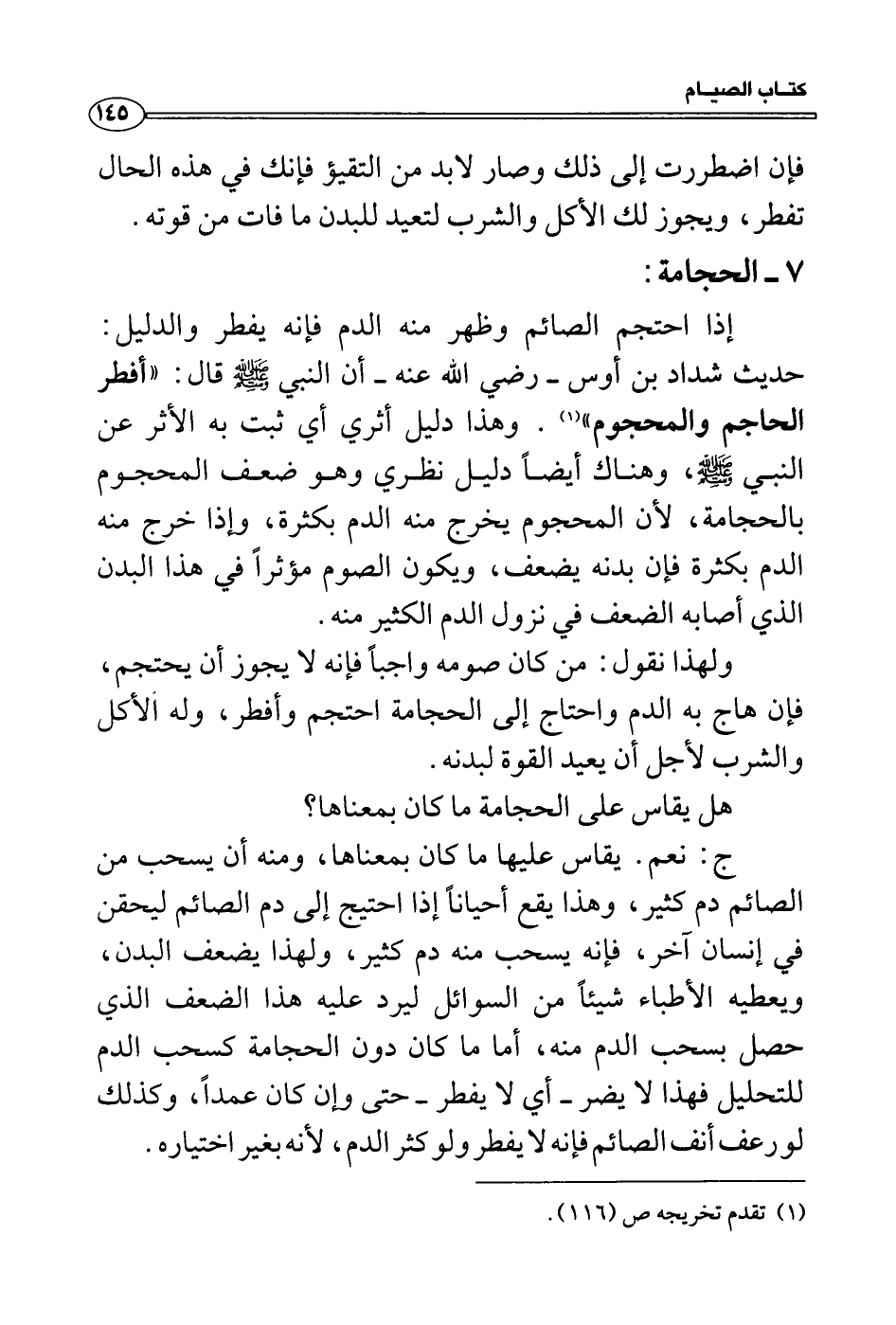 ج: نعم. يقاس عليها ما كان بمعناها، ومنه أن يسحب من الصائم دم كثير، وهذا يقع أحياناً إذا احتيج إلى دم الصائم ليحقن في إنسان آخر، فإنه يسحب منه دم كثير، ولهذا يضعف البدن، ويعطيه الأطباء شيئاً من السوائل ليرد عليه هذا الضعف الذي حصل بسحب الدم منه، أما ما كان دون الحجامة كسحب الدم للتحليل فهذا لا يضر أي لا يفطر حتى وإن كان عمداً، وكذلك لو رعف أنف الصائم فإنه لا يفطر ولو كثر الدم، لأنه بغير اختياره.