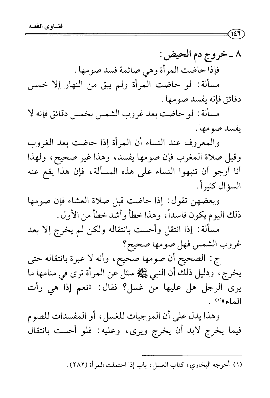 والمعروف عند النساء أن المرأة إذا حاضت بعد الغروب وقبل صلاة المغرب فإن صومها يفسد، وهذا غير صحيح، ولهذا أنا أرجو أن تنبهوا النساء على هذه المسألة، فإن هذا يقع عنه السؤال كثيراً.