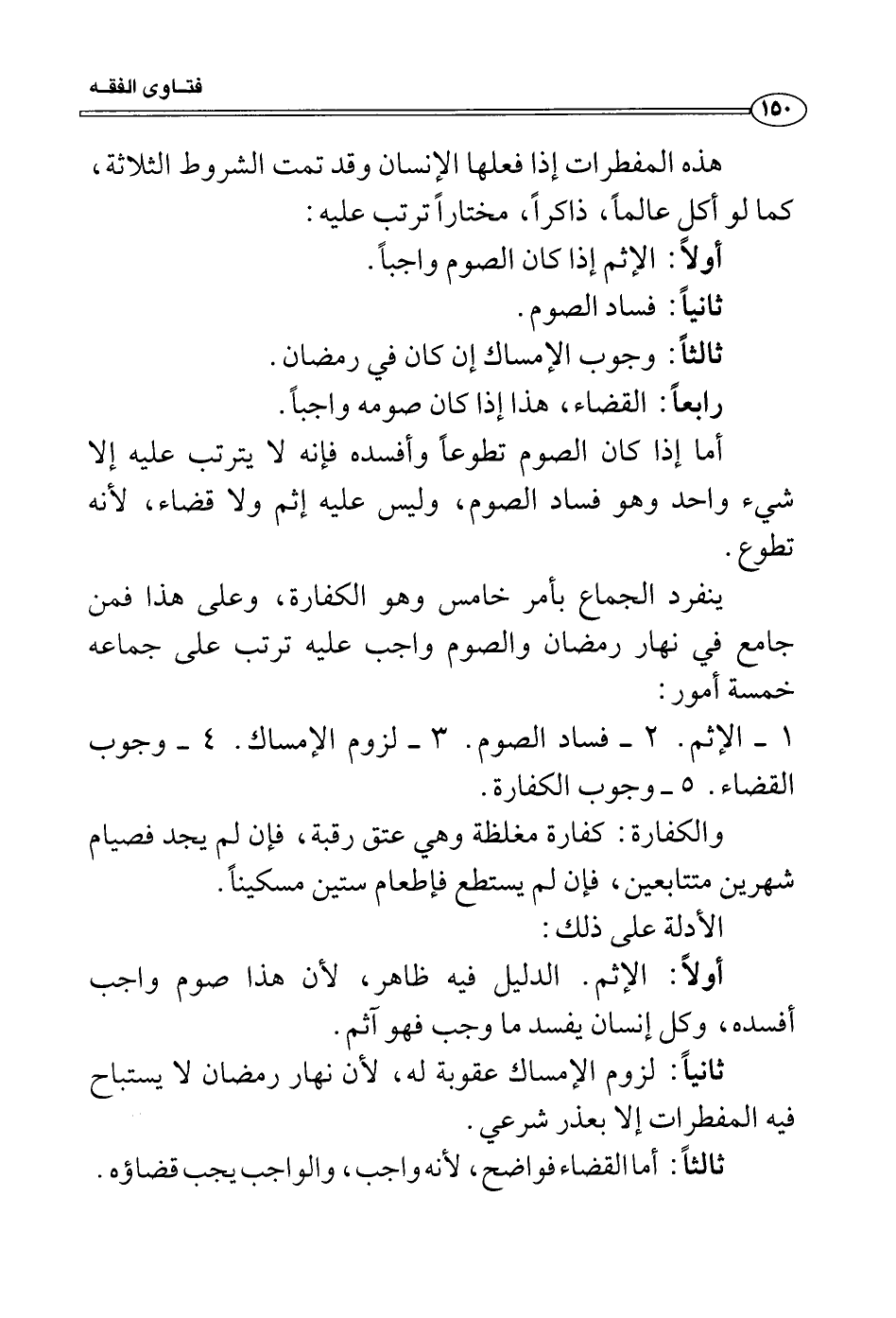 1 الإثم. 2 فساد الصوم. 3 لزوم الإمساك. 4 وجوب القضاء. 5 وجوب الكفارة.