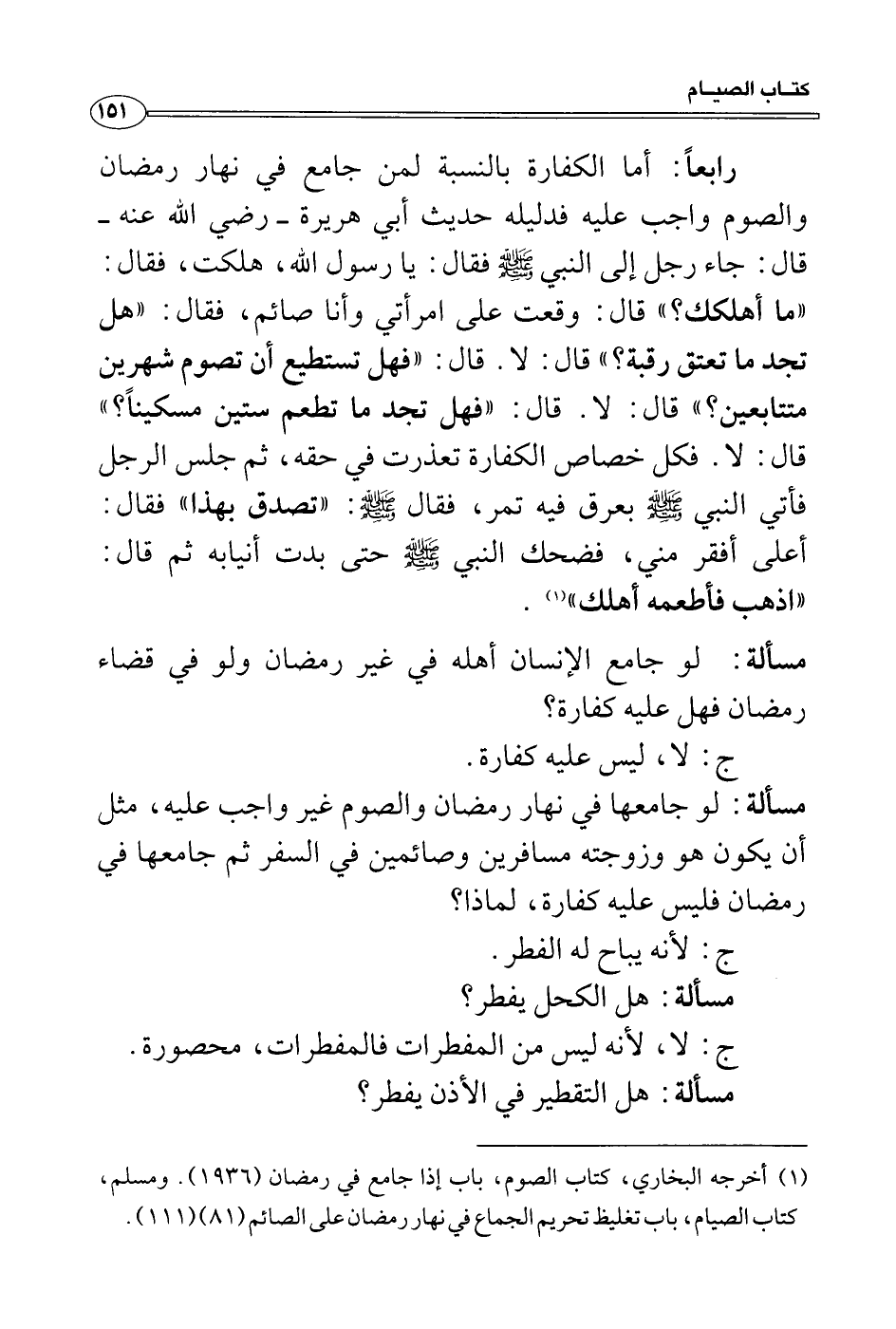 رابعاً: أما الكفارة بالنسبة لمن جامع في نهار رمضان والصوم واجب عليه فدليله حديث أبي هريرة رضي الله عنه قال: جاء رجل إلى النبي صَلَّى اللَّهُ عَلَيْهِ وَسَلَّمَ فقال: يا رسول الله، هلكت، فقال: «ما أهلكك؟» قال: وقعت على امرأتي وأنا صائم، فقال: «هل تجد ما تعتق رقبة؟» قال: لا. قال: «فهل تستطيع أن تصوم شهرين متتابعين؟» قال: لا. قال: «فهل تجد ما تطعم ستين مسكيناً؟» قال: لا. فكل خصاص الكفارة تعذرت في حقه، ثم جلس الرجل فأتي النبي صَلَّى اللَّهُ عَلَيْهِ وَسَلَّمَ بعرق فيه تمر، فقال صَلَّى اللَّهُ عَلَيْهِ وَسَلَّمَ: «تصدق بهذا» فقال: أعلى أفقر مني، فضحك النبي صَلَّى اللَّهُ عَلَيْهِ وَسَلَّمَ حتى بدت أنيابه ثم قال: «اذهب فأطعمه أهلك» .