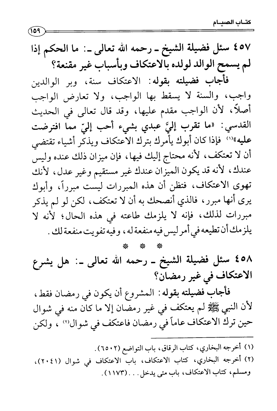 فأجاب فضيلته بقوله: الاعتكاف سنة، وبر الوالدين واجب، والسنة لا يسقط بها الواجب، ولا تعارض الواجب أصلاً، لأن الواجب مقدم عليها، وقد قال تعالى في الحديث القدسي: «ما تقرب إليَّ عبدي بشيء أحب إليّ مما افترضت عليه» فإذا كان أبوك يأمرك بترك الاعتكاف ويذكر أشياء تقتضي أن لا تعتكف، لأنه محتاج إليك فيها، فإن ميزان ذلك عنده وليس عندك، لأنه قد يكون الميزان عندك غير مستقيم وغير عدل، لأنك تهوى الاعتكاف، فتظن أن هذه المبررات ليست مبرراً، وأبوك يرى أنها مبرر، فالذي أنصحك به أن لا تعتكف، لكن لو لم يذكر مبررات لذلك، فإنه لا يلزمك طاعته في هذه الحال؛ لأنه لا يلزمك أن تطيعه في أمر ليس فيه منفعة له، وفيه تفويت منفعة لك.