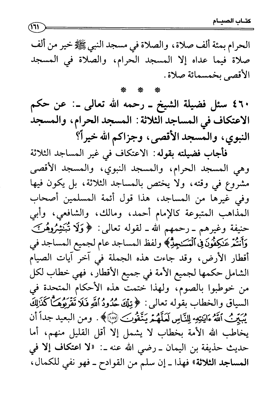 فأجاب فضيلته بقوله: الاعتكاف في غير المساجد الثلاثة وهي المسجد الحرام، والمسجد النبوي، والمسجد الأقصى مشروع في وقته، ولا يختص بالمساجد الثلاثة، بل يكون فيها وفي غيرها من المساجد، هذا قول أئمة المسلمين أصحاب المذاهب المتبوعة كالإمام أحمد، ومالك، والشافعي، وأبي حنيفة وغيرهم رحمهم الله لقوله تعالى: {وَلاَ تُبَاشِرُوهُنَّ وَأَنتُمْ عَاكِفُونَ فِي الْمَسَاجِدِ تِلْكَ حُدُودُ اللهِ فَلاَ تَقْرَبُوهَا كَذالِكَ يُبَيِّنُ اللهُ آيَاتِهِ لِلنَّاسِ لَعَلَّهُمْ يَتَّقُونَ} ولفظ المساجد عام لجميع المساجد في أقطار الأرض، وقد جاءت هذه الجملة في آخر آيات الصيام الشامل حكمها لجميع الأمة في جميع الأقطار، فهي خطاب لكل من خوطبوا بالصوم، ولهذا ختمت هذه الأحكام المتحدة في السياق والخطاب بقوله تعالى: {تِلْكَ حُدُودُ اللهِ فَلاَ تَقْرَبُوهَا كَذالِكَ يُبَيِّنُ اللهُ آيَاتِهِ لِلنَّاسِ لَعَلَّهُمْ يَتَّقُونَ} . ومن البعيد جداً أن يخاطب الله الأمة بخطاب لا يشمل إلا أقل القليل منهم، أما حديث حذيفة بن اليمان رضي الله عنه: «لا اعتكاف إلا في المساجد الثلاثة» فهذا إن سلم من القوادح فهو نفي للكمال،