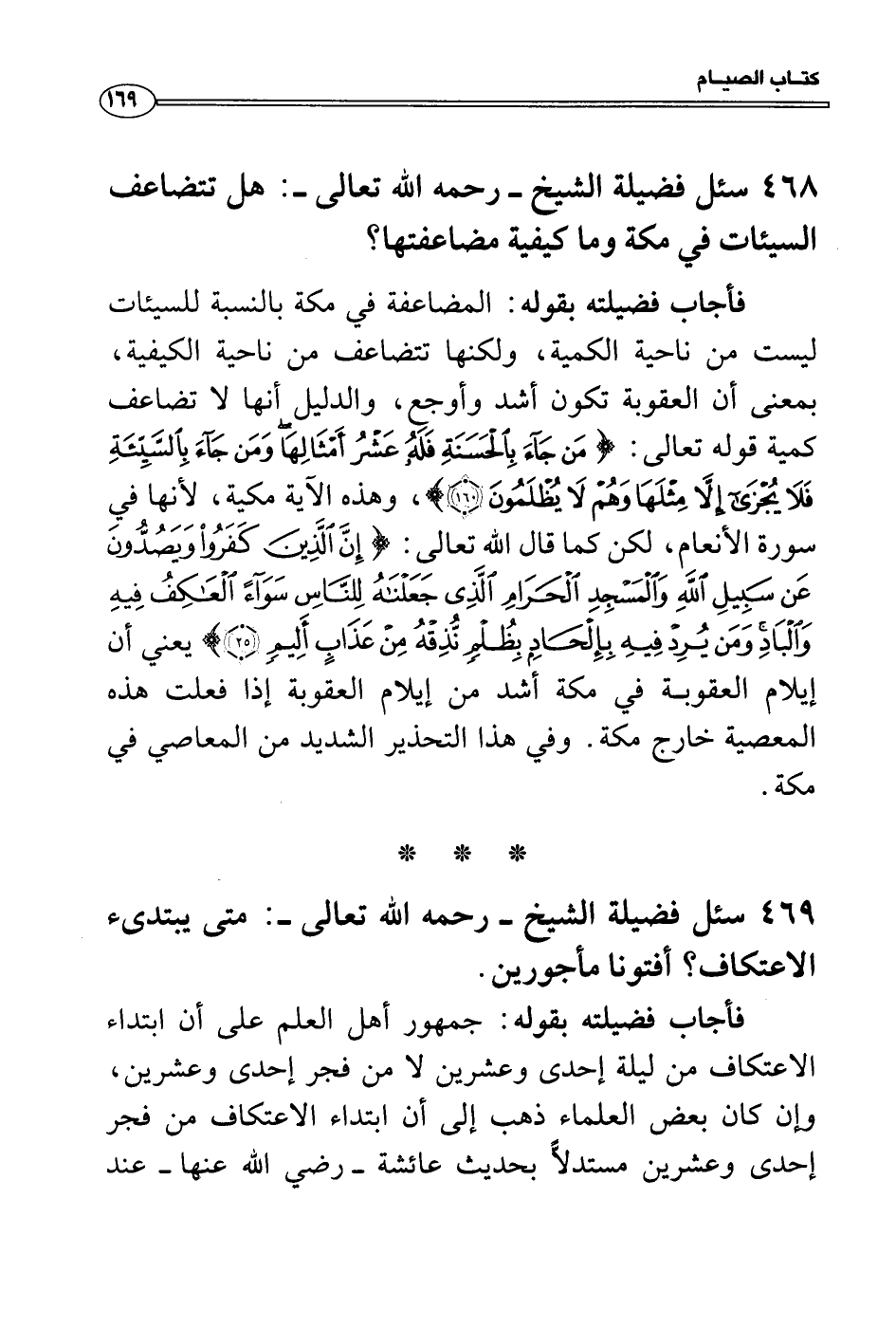 فأجاب فضيلته بقوله: المضاعفة في مكة بالنسبة للسيئات ليست من ناحية الكمية، ولكنها تتضاعف من ناحية الكيفية، بمعنى أن العقوبة تكون أشد وأوجع، والدليل أنها لا تضاعف كمية قوله تعالى: {مَن جَآءَ بِالْحَسَنَةِ فَلَهُ عَشْرُ أَمْثَالِهَا وَمَن جَآءَ بِالسَّيِّئَةِ فَلاَ يُجْزَى" إِلاَّ مِثْلَهَا وَهُمْ لاَ يُظْلَمُونَ} ، وهذه الآية مكية، لأنها في سورة الأنعام، لكن كما قال الله تعالى: {إِنَّ الَّذِينَ كَفَرُواْ وَيَصُدُّونَ عَن سَبِيلِ اللهِ وَالْمَسْجِدِ الْحَرَامِ الَّذِى جَعَلْنَاهُ لِلنَّاسِ سَوَآءً الْعَاكِفُ فِيهِ وَالْبَادِ وَمَن يُرِدْ فِيهِ بِإِلْحَادٍ بِظُلْمٍ نُّذِقْهُ مِنْ عَذَابٍ أَلِيمٍ} يعني أن إيلام العقوبة في مكة أشد من إيلام العقوبة إذا فعلت هذه المعصية خارج مكة. وفي هذا التحذير الشديد من المعاصي في مكة.