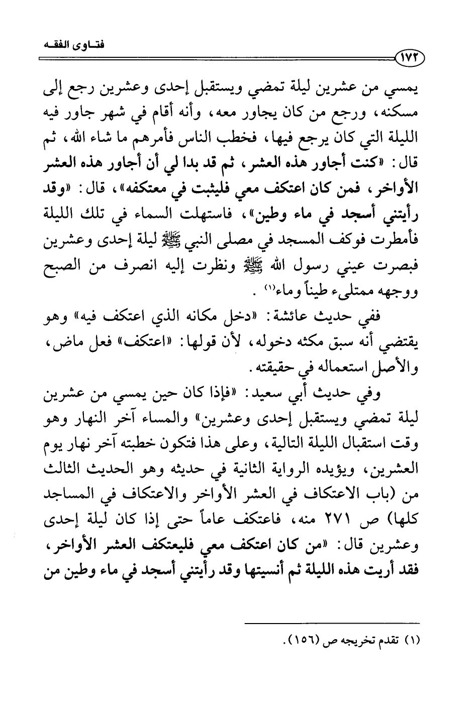 يمسي من عشرين ليلة تمضي ويستقبل إحدى وعشرين رجع إلى مسكنه، ورجع من كان يجاور معه، وأنه أقام في شهر جاور فيه الليلة التي كان يرجع فيها، فخطب الناس فأمرهم ما شاء الله، ثم قال: «كنت أجاور هذه العشر، ثم قد بدا لي أن أجاور هذه العشر الأواخر، فمن كان اعتكف معي فليثبت في معتكفه» ، قال: «وقد رأيتني أسجد في ماء وطين» ، فاستهلت السماء في تلك الليلة فأمطرت فوكف المسجد في مصلى النبي صَلَّى اللَّهُ عَلَيْهِ وَسَلَّمَ ليلة إحدى وعشرين فبصرت عيني رسول الله صَلَّى اللَّهُ عَلَيْهِ وَسَلَّمَ ونظرت إليه انصرف من الصبح ووجهه ممتلىء طيناً وماء.