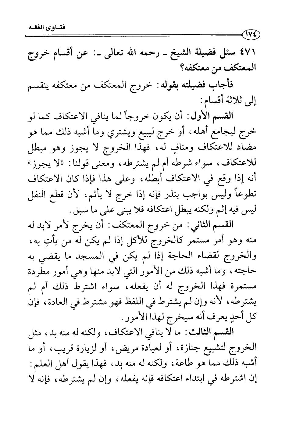 174 سئل فضيلة الشيخ - رحمه الله تعالى -: عن أقسام خروج المعتكف من معتكفه؟