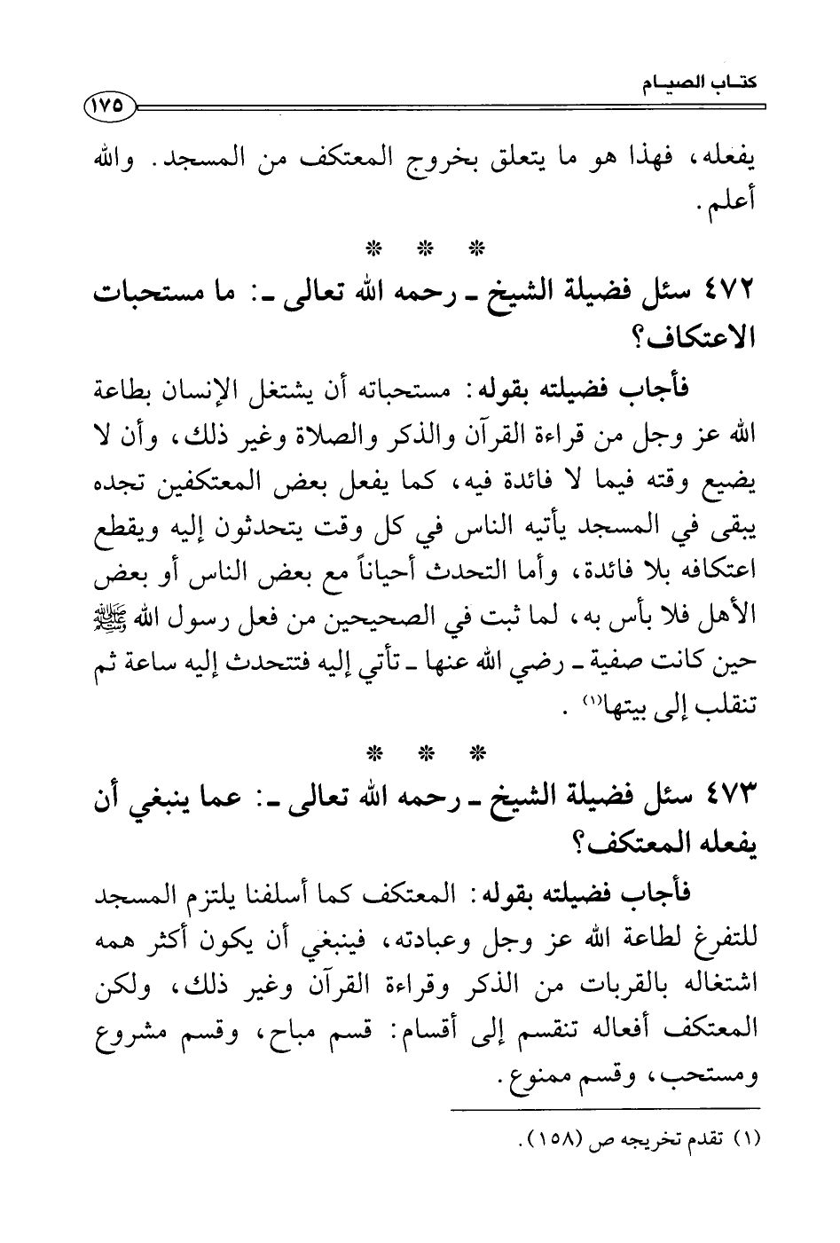 سئل فضيلة الشيخ - رحمه الله تعالى -: ما مستحبات الاعتكاف؟
