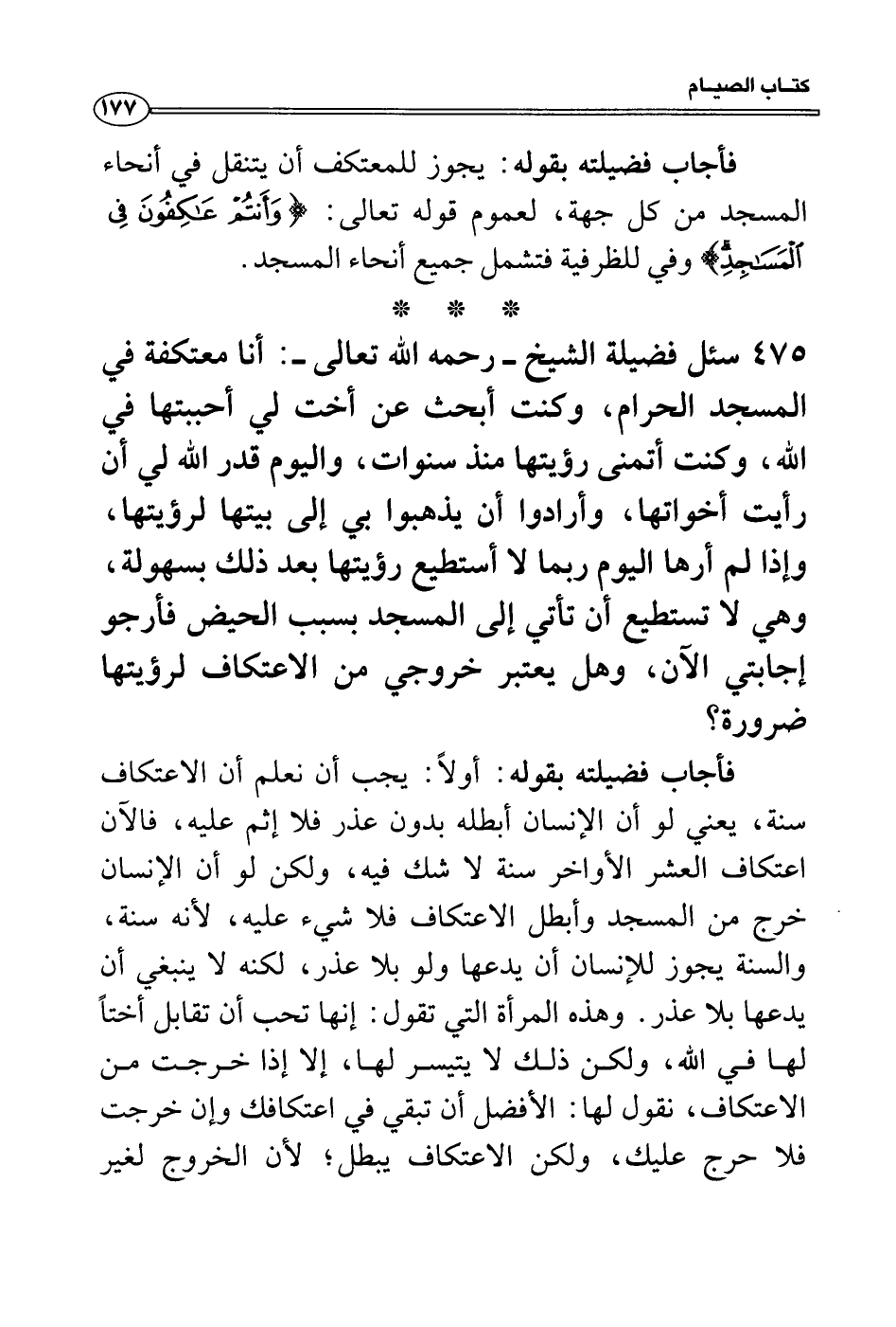 فأجاب فضيلته بقوله: أولاً: يجب أن نعلم أن الاعتكاف سنة، يعني لو أن الإنسان أبطله بدون عذر فلا إثم عليه، فالآن اعتكاف العشر الأواخر سنة لا شك فيه، ولكن لو أن الإنسان خرج من المسجد وأبطل الاعتكاف فلا شيء عليه، لأنه سنة، والسنة يجوز للإنسان أن يدعها ولو بلا عذر، لكنه لا ينبغي أن يدعها بلا عذر. وهذه المرأة التي تقول: إنها تحب أن تقابل أختاً لها في الله، ولكن ذلك لا يتيسر لها، إلا إذا خرجت من الاعتكاف، نقول لها: الأفضل أن تبقي في اعتكافك وإن خرجت فلا حرج عليك، ولكن الاعتكاف يبطل؛ لأن الخروج لغير