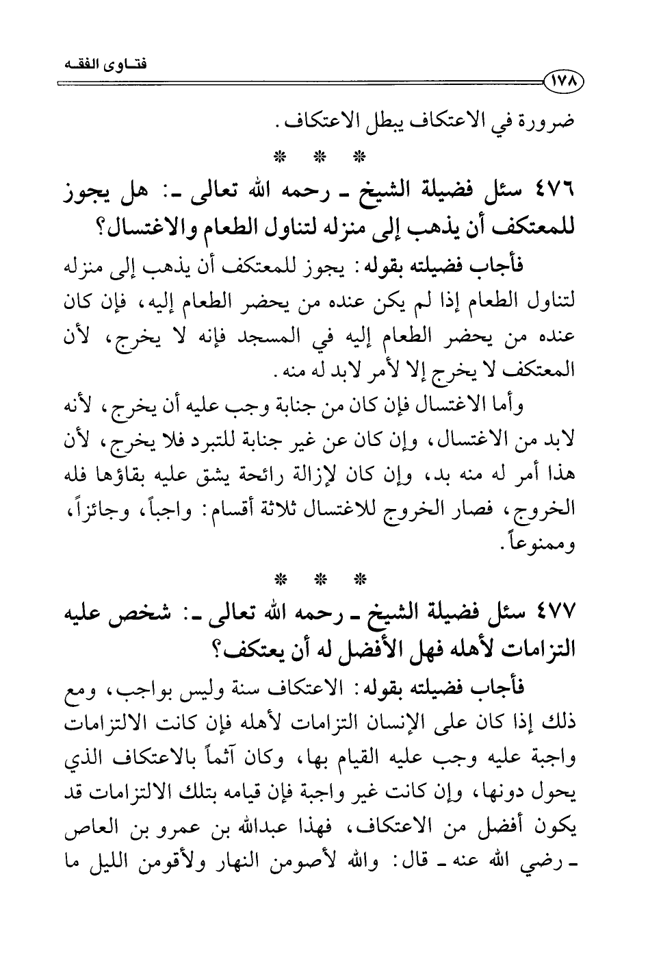 سئل فضيلة الشيخ - رحمه الله تعالى -: هل يجوز للمعتكف أن يذهب إلى منزله لتناول الطعام والاغتسال؟