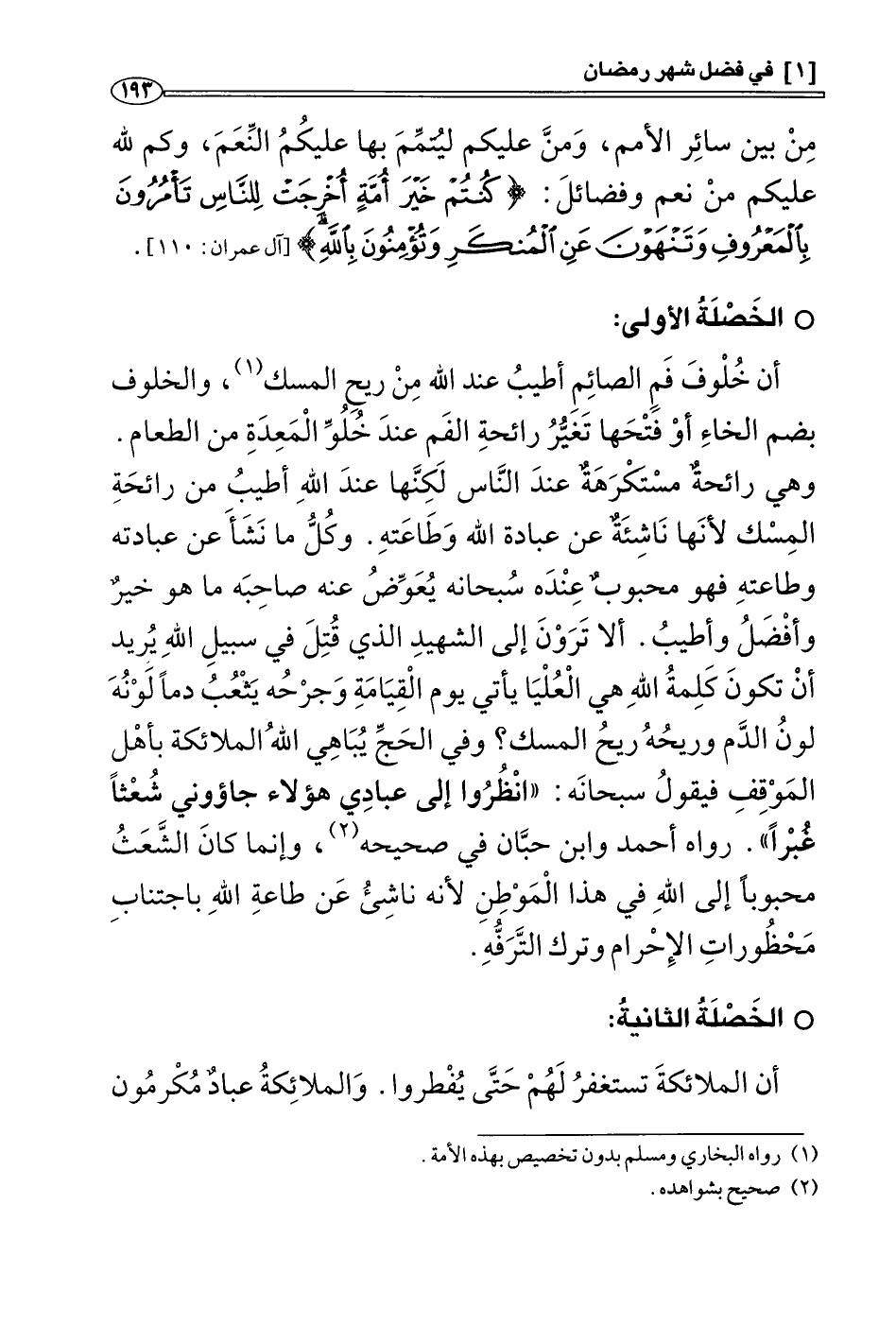 * الخصلة الأولى: «أن خُلُوف فم الصائم أطيب عند الله من ريح المسك» (¬1) , والخلوف بضم الخاء أو فتحها تغير رائحة الفم عند خلو المعدة من الطعام , وهي رائحة مستكرهة عند الناس لكنها عند الله أطيب من رائحة المسك؛ لأنها ناشئة عن عبادة الله وطاعته , وكل ما نشأ عن عبادته وطاعته فهو محبوب عنده سبحانه يعوِّض عنه صاحبه ما هو خير وأفضل وأطيب , ألا ترون إلى الشهيد الذي قُتِل في سبيل الله يريد أن تكون كلمة الله هي العليا يأتي يوم القيامة وجرحه يثعب دما لونه لون الدم وريحه ريح المسك؟ وفي الحج يباهي الله الملائكة بأهل الموقف فيقول سبحانه: «انظروا إلى عبادي هؤلاء جاءوني شُعثا غُبرا» (¬2) ، وإنما كان الشَّعَث محبوبا إلى الله في هذا الموطن لأنه ناشئ عن طاعة الله باجتناب محظورات الإحرام وترك الترفه.