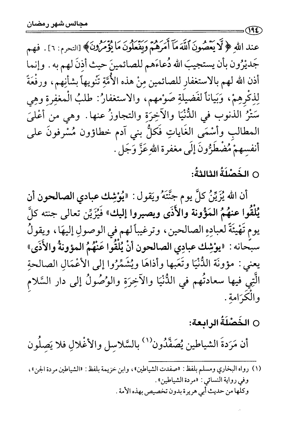 (¬1) رواه البخاري ومسلم بلفظ: صفدت الشياطين , وابن خزيمة بلفظ: الشياطين مردة الجن، وفي رواية للنسائي: مردة الشياطين. وكلهم من حديث أبي هريرة بدون تخصيص بهذه الأمة.