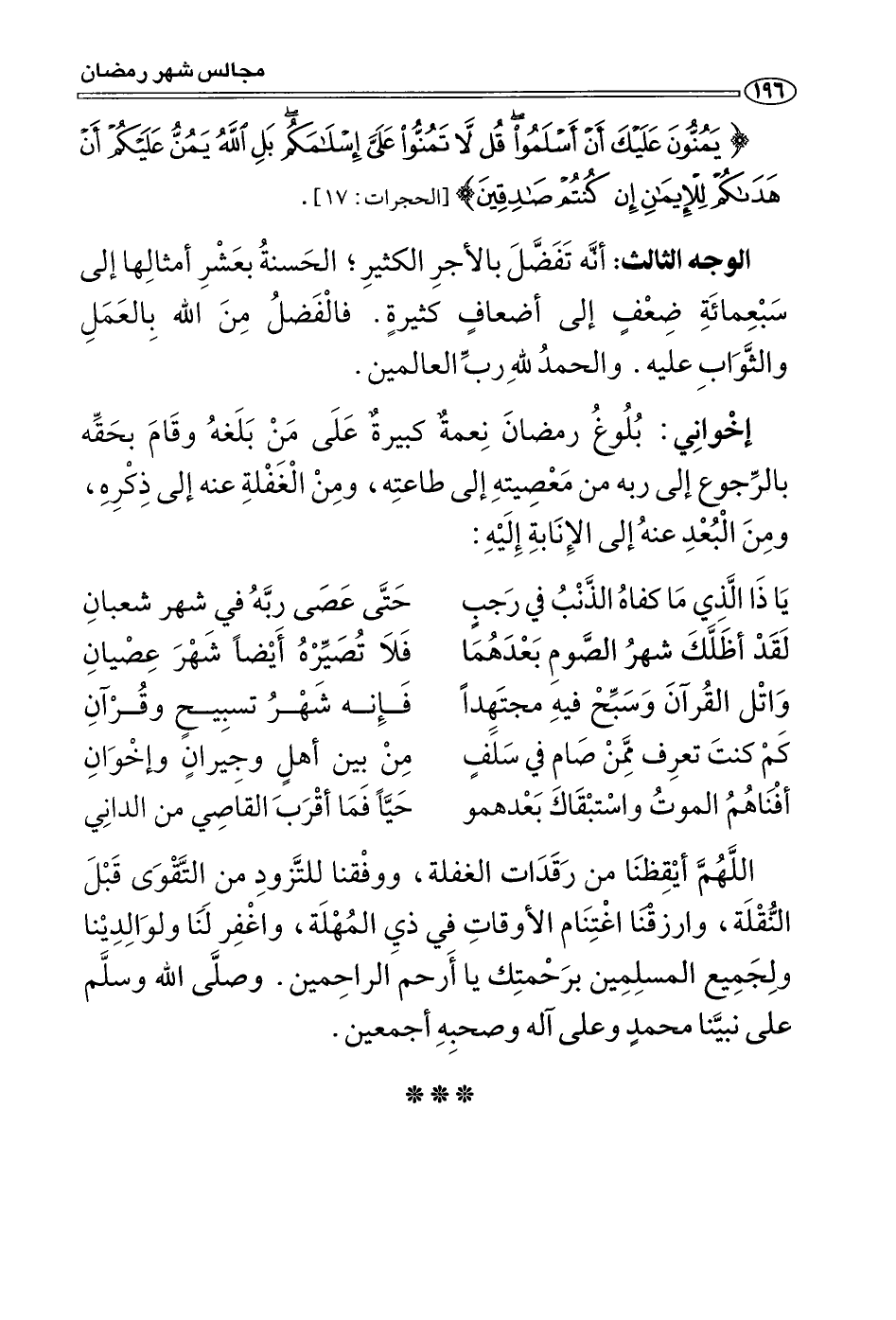 إخواني: بلوغ رمضان نعمة كبيرة على من بلغه وقام بحقه بالرجوع إلى ربه من معصيته إلى طاعته , ومن الغفلة عنه إلى ذكره , ومن البعد عنه إلى الإنابة إليه.