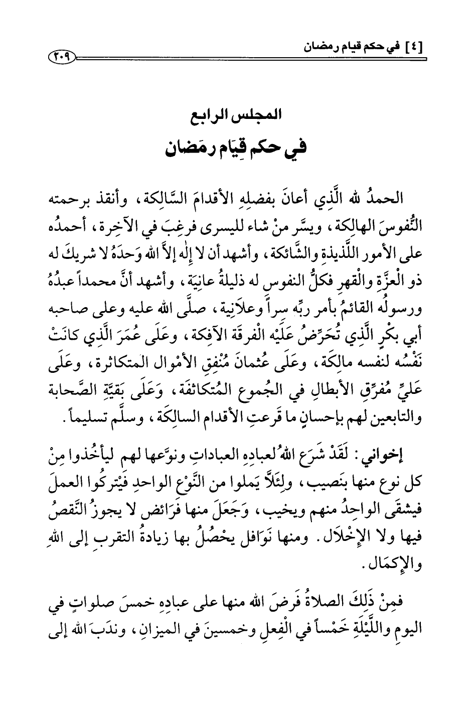 الحمد لله الذي أعان بفضله الأقدام السالكة، وأنقذ برحمته النفوس الهالكة، ويسَّر من شاء لليسرى فرغب في الآخرة، أحمده على الأمور اللذيذة والشائكة، وأشهد أن لا إله إلا الله وحده لا شريك له، ذو العزة والقهر فكل النفوس له ذليلة عانية، وأشهد أن محمدا عبده ورسوله القائم بأمر ربه سرا وعلانية، صلى الله عليه وعلى صاحبه أبي بكر الذي تُحَرِّض عليه الفرقة الآفكة، وعلى عمر الذي كانت نفسه لنفسه مالكة، وعلى عثمان منفق الأموال المتكاثرة، وعلى علي مفرِّق الأبطال في الجموع المتكاثفة، وعلى بقية الصحابة والتابعين لهم بإحسان ما قرعت الأقدام السالكة، وسلم تسليما.