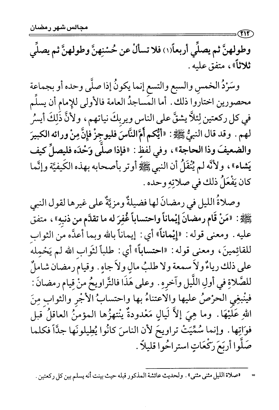 وصلاة الليل في رمضان لها فضيلة ومزية على غيرها لقول النبي صَلَّى اللَّهُ عَلَيْهِ وَسَلَّمَ: «من قام رمضان إيمانا واحتسابا غفر له ما تقدم من ذنبه» . (¬2) ومعنى قوله: " إيمانا " أي: إيمانا بالله وبما أعَدَّه من الثواب للقائمين، ومعنى قوله: " احتسابا " أي: طلبا لثواب الله لم يحمله على ذلك رياء ولا سمعة ولا طلب مال ولا جاه، وقيام رمضان شامل للصلاة في أول الليل وآخره، وعلى هذا فالتراويح من قيام رمضان، فينبغي الحرص عليها والاعتناء بها واحتساب الأجر والثواب من الله عليها، وما هي إلا ليالٍ معدودة ينتهزها المؤمن العاقل قبل فواتها، وإنما سُمِّيَتْ تراويحَ لأن الناس كانوا يطيلونها جدا فكلما صلوا أربع ركعات استراحوا قليلا.