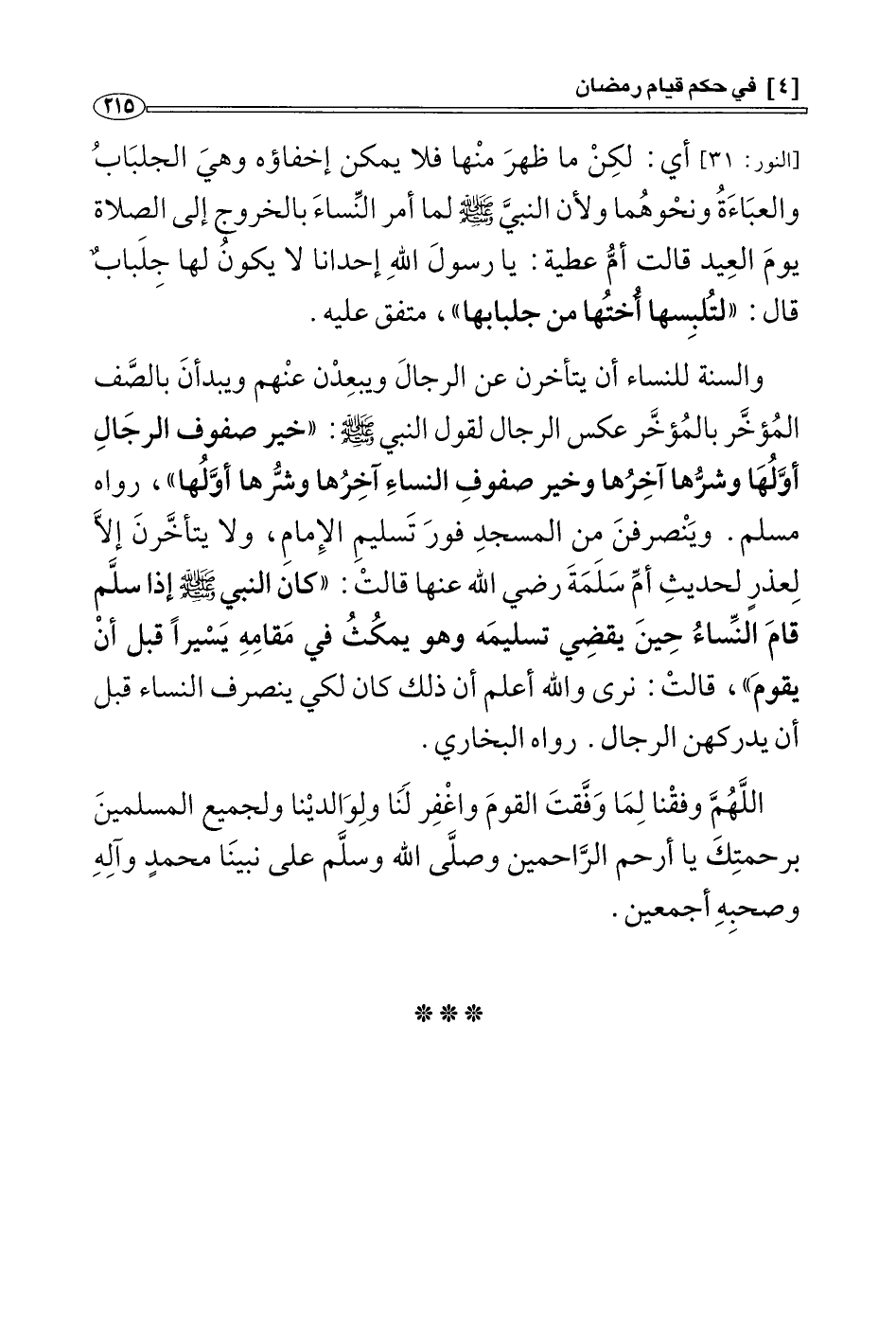 النور: 31] ، أي: لكن ما ظهر منها فلا يمكن إخفاؤه وهو الجلباب والعباءة ونحوهما، ولأن النبي صَلَّى اللَّهُ عَلَيْهِ وَسَلَّمَ «لما أمر النساء بالخروج إلى الصلاة يوم العيد قالت أم عطية: يا رسول الله إحدانا لا يكون لها جلباب. قال: " لِتُلْبِسْهَا أختُها من جلبابها.» (¬1) والسنة للنساء أن يتأخرن عن الرجال ويبعدن عنهم، ويبدأن بالصف المؤخَّر فالمؤخر عكس الرجال، لقول النبي صَلَّى اللَّهُ عَلَيْهِ وَسَلَّمَ: «خير صفوف الرجال أولها وشرها آخرها، وخير صفوف النساء آخرها وشرها أولها» (¬2) ، وينصرفن من المسجد فور تسليم الإمام، ولا يتأخرن إلا لعذر «لحديث أم