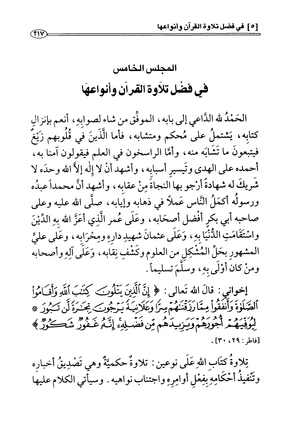 المجلس الخامس: في فضل تلاوة القرآن وأنواعها