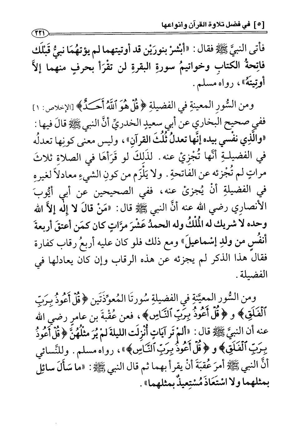 ومن السور المعينة في الفضيلة {قُلْ هُوَ اللهُ أَحَدٌ} ، فعن أبي سعيد الخدري أن النبي صَلَّى اللَّهُ عَلَيْهِ وَسَلَّمَ قال فيها: «والذي نفسي بيده إنها تعدل ثلث القرآن» (¬2) ، وليس معنى كونها تعدله في الفضيلة أنها تجزئ عنه، ولذلك لو قرأها في الصلاة ثلاث مرات لم تجزئه عن الفاتحة , ولا يلزم من كون الشيء معادلا لغيره في الفضيلة أن يجزئ، فعن أبي أيوب الأنصاري رضي الله عنه أن النبي صَلَّى اللَّهُ عَلَيْهِ وَسَلَّمَ قال: «من قال لا إله إلا الله وحده لا شريك له، له الْمُلْك وله الحمد عشر مرات كان كمن أعتق أربعة أنفس من ولد إسماعيل» (¬3) ومع ذلك فلو كان عليه أربع رقاب كفارة فقال هذا الذكر لم يُجْزِئه عن هذه الرقاب وإن كان يعادلها في الفضيلة.