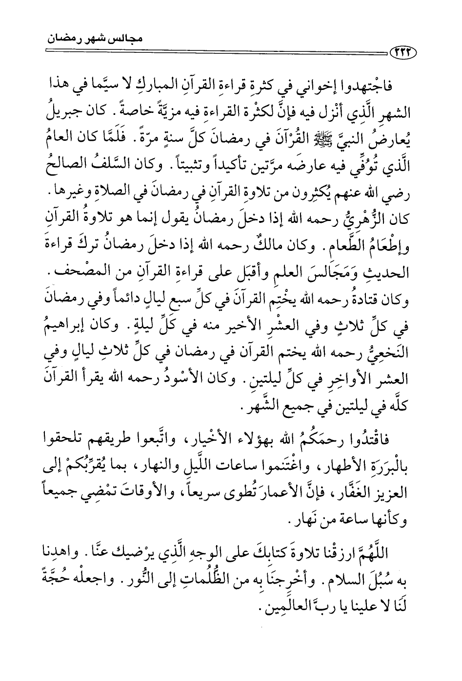 فاجتهدوا إخواني في كثرة قراءة القرآن المبارك لا سِيَّمَا في هذا الشهر الذي أنزل فيه، فإن لكثرة القراءة فيه مزية خاصة، وكان جبريل يعارض النبي صَلَّى اللَّهُ عَلَيْهِ وَسَلَّمَ القرآن في رمضان كل سنة مرة، فلما كان العام الذي توفي فيه عارضه مرتين تأكيدا وتثبيتا، وكان السلف الصالح رضي الله عنهم يُكْثِرون من تلاوة القرآن في رمضان في الصلاة وغيرها، وكان الزهري رحمه الله إذا دخل رمضان يقول: إنما هو تلاوة القرآن وإطعام الطعام، وكان مالك رحمه الله إذا دخل رمضان ترك قراءة الحديث ومجالس العلم وأقبل على قراءة القرآن من المصحف، وكان قتادة رحمه الله يختم القرآن في كل سبع ليالٍ دائما وفي رمضان في كل ثلاث، وفي العشر الأخير منه في كل ليلة، وكان إبراهيم النخعي رحمه الله يختم القرآن في رمضان في كل ثلاث ليالٍ وفي العشر الأواخر في كل ليلتين، وكان الأسود رحمه الله يقرأ القرآن كله في ليلتين في جميع الشهر.
