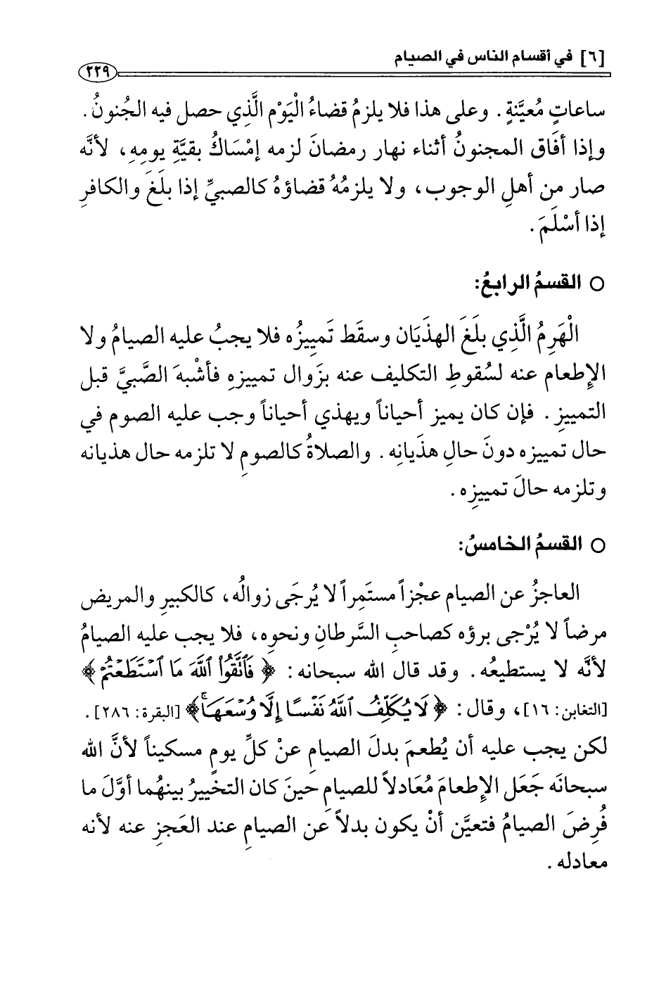 * القسم الخامس: العاجز عن الصيام عجزا مستمرا لا يرجى زواله كالكبير والمريض مرضا لا يرجى برؤه كصاحب السرطان ونحوه , فلا يجب عليه الصيام لأنه لا يستطيعه وقد قال الله سبحانه: {فَاتَّقُوا اللهَ مَا اسْتَطَعْتُمْ} [التغابن: 16] ، وقال: {لَا يُكَلِّفُ اللهُ نَفْسًا إِلَّا وُسْعَهَا} [البقرة: 286] ، لكن يجب عليه أن يطعم بدل الصيام عن كل يوم مسكينا؛ لأن الله سبحانه جعل الإطعام معادلا للصيام حين كان التخيير بينهما أول ما فُرِضَ الصيام , فتعين أن يكون بدلا عن الصيام عند العجز عنه لأنه معادل له.
