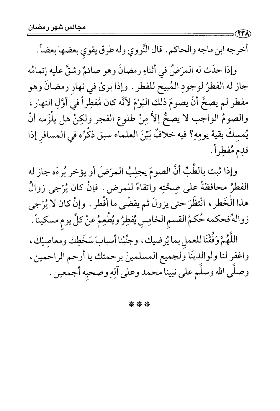 وإذا حدث له المرض في أثناء رمضان وهو صائم وشق عليه إتمامه جاز له الفطر لوجود المبيح للفطر , وإذا برئ في نهار رمضان وهو مفطر لم يصح أن يصوم ذلك اليوم لأنه كان مفطرا في أول النهار , والصوم لا يصح إلا من طلوع الفجر , ولكن هل يلزمه أن يمسك بقية يومه؟ فيه خلاف بين العلماء سبق ذكره في المسافر إذا قدم مفطرا.