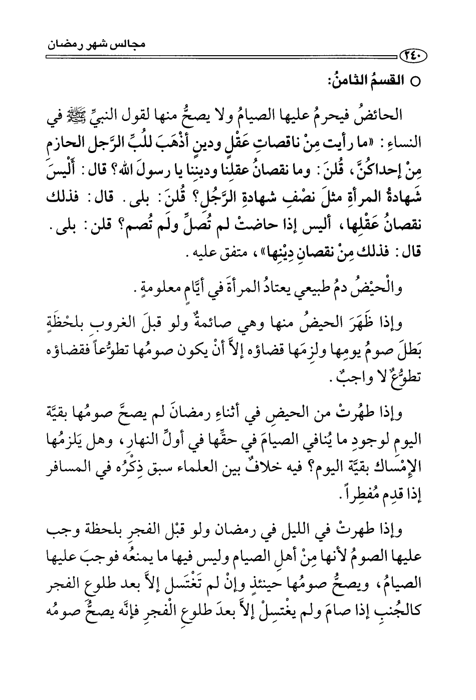 القسم الثامن: الحائض فيحرم عليها الصيام ولا يصح منها لقول النبي صَلَّى اللَّهُ عَلَيْهِ وَسَلَّمَ في النساء: «ما رأيت من ناقصات عقل ودين أذهب لِلُبِّ الرجل الحازم من إحداكن ". قلن: وما نقصان عقلنا وديننا يا رسول الله؟ قال: " أليس شهادة المرأة مثل نصف شهادة الرجل؟ قلن: بلى. قال: " فذلك نقصان عقلها، أليس إذا حاضت لم تُصَلِّ ولم تصم؟ قلن: بلى. قال: " فذلك من نقصان دينها» (¬1) .