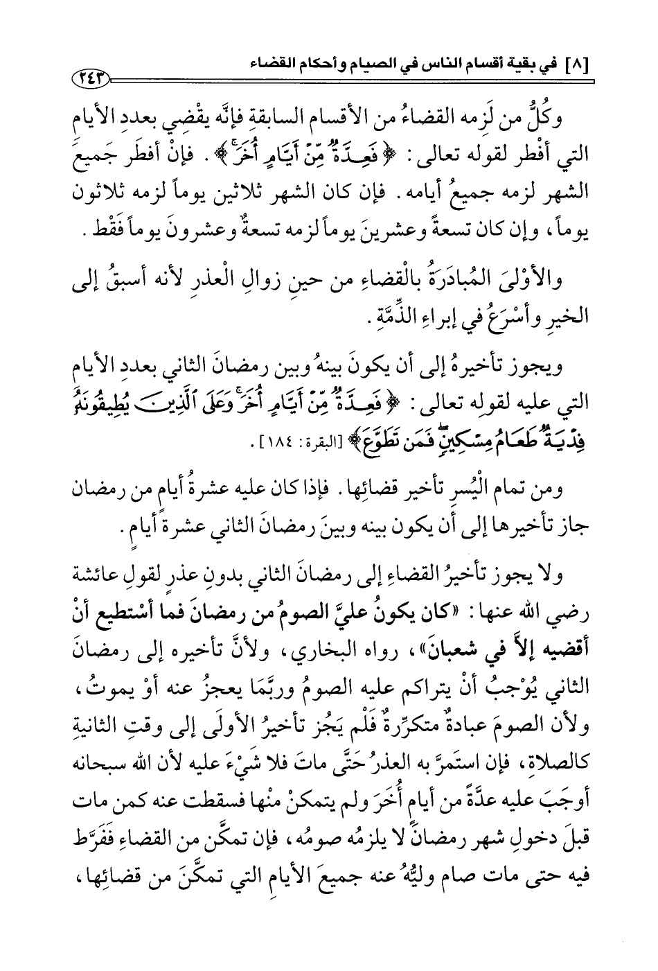ويجوز تأخيره إلى أن يكون بينه وبين رمضان الثاني بعدد الأيام التي عليه لقوله تعالى: {فَعِدَّةٌ مِنْ أَيَّامٍ أُخَرَ يُرِيدُ اللهُ بِكُمُ الْيُسْرَ وَلَا يُرِيدُ بِكُمُ الْعُسْرَ} [البقرة 185] . ومن تمام اليسر جواز تأخير قضائها، فإذا كان عليه عشرة أيام من رمضان جاز تأخيرها إلى أن يكون بينه ويبن رمضان الثاني عشرة أيام.