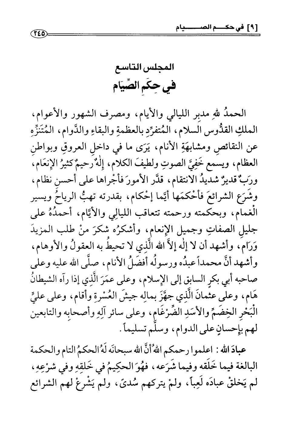الحمد لله مدبر الليالي والأيام، ومصرِّف الشهور والأعوام، الملك القدوس السلام، المتفرِّد بالعظمة والبقاء والدوام، الْمُتَنَزِّه عن النقائص ومشابهة الأنام، يرى ما في داخل العروق وبواطن العظام، ويسمع خفي الصوت ولطيف الكلام، إله رحيم كثير الإنعام، ورب قدير شديد الانتقام، قدَّر الأمور فأجراها على أحسن نظام، وشَرَع الشرائع فأحكمها أيما إحكام، بقدرته تهب الرياح ويسير الغمام، وبحكمته ورحمته تتعاقب الليالي والأيام، أحمده على جليل الصفات وجميل الإنعام، وأشكره شكر من طلب المزيد ورام، وأشهد أن لا إله إلا الله الذي لا تحيط به العقول والأوهام، وأشهد أن محمدا عبده ورسوله أفضل الأنام، صلى الله عليه وعلى صاحبه أبي بكر السابق إلى الإسلام، وعلى عمر الذي إذا رآه الشيطان هام، وعلى عثمان الذي جهز بماله جيش العسرة وأقام، وعلى علي البحر الخضم والأسد الضرغام، وعلى سائر آله وأصحابه والتابعين لهم بإحسان على الدوام، وسلم تسليما.