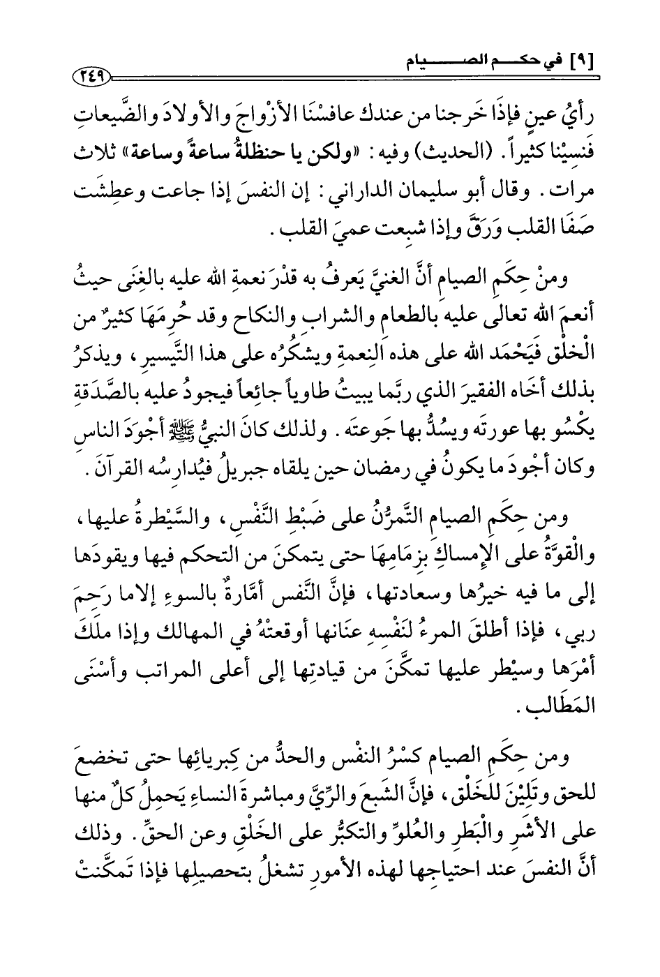 * ومن حكم الصيام: كسر النفس والحد من كبريائها حتى تخضع للحق وتلين للخلق، فإن الشبع والري ومباشرة النساء يحمل كل منها على الأشَر والبطر والعلو والتكبر على الخلق وعن الحق، وذلك أن النفس عند احتياجها لهذه الأمور تشتغل بتحصيلها، فإذا تمكَّنَت