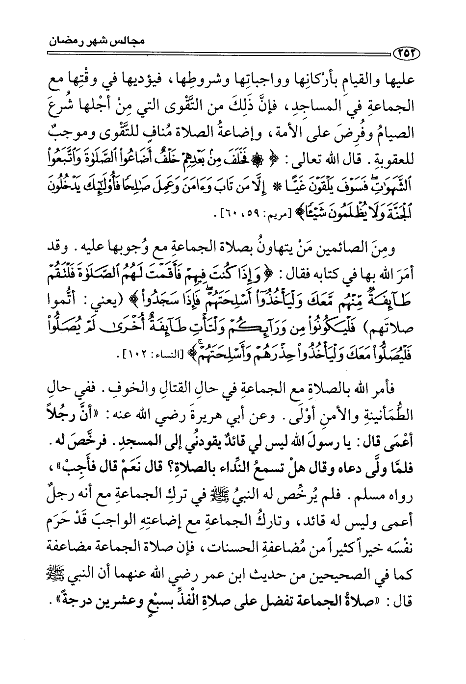 عليها والقيام بأركانها وواجباتها وشروطها، فيؤديها في وقتها مع الجماعة في المساجد، فإن ذلك من التقوى التي من أجلها شُرِع الصيام وفُرِض على الأمة، وإضاعة الصلاة مُنَافٍ للتقوى وموجب للعقوبة، قال الله تعالى: {فَخَلَفَ مِنْ بَعْدِهِمْ خَلْفٌ أَضَاعُوا الصَّلَاةَ وَاتَّبَعُوا الشَّهَوَاتِ فَسَوْفَ يَلْقَوْنَ غَيًّا} {إِلَّا مَنْ تَابَ وَآمَنَ وَعَمِلَ صَالِحًا فَأُولَئِكَ يَدْخُلُونَ الْجَنَّةَ وَلَا يُظْلَمُونَ شَيْئًا} [مريم: 59 - 60] .