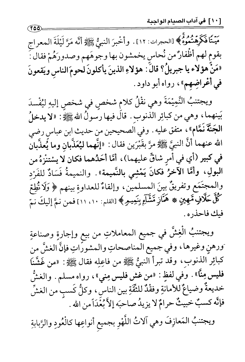 * ويجتنب النميمة، وهي نقل كلام شخص في شخص إليه ليُفسد بينهما , وهي من كبائر الذنوب , قال فيها رسول صَلَّى اللَّهُ عَلَيْهِ وَسَلَّمَ: «لا يدخل الجنة نمام» (¬1) ، وعن ابن عباس رضي الله عنهما «أن النبي صَلَّى اللَّهُ عَلَيْهِ وَسَلَّمَ مر بقبرين فقال: " إنهما لَيعذَّبان وما يعذَّبان في كبير (أي: في أمر شاق عليهما) أما أحدهما فكان لا يسْتَنْزه من البول، وأما الآخر فكان يمشي بالنميمة» (¬2) ، والنميمة فساد للفرد والمجتمع وتفريق بين المسلمين، وإلقاء للعداوة بينهم {وَلَا تُطِعْ كُلَّ حَلَّافٍ مَهِينٍ} {هَمَّازٍ مَشَّاءٍ بِنَمِيمٍ} [القلم: 10 - 11] ، فمن نَمَّ إليك نَمَّ فيك فاحذره.