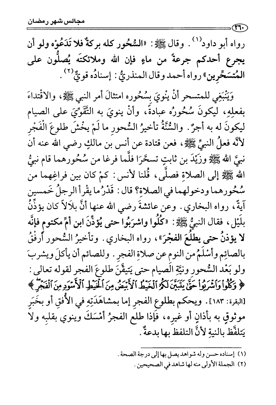وقال صَلَّى اللَّهُ عَلَيْهِ وَسَلَّمَ: «السحور كله بركة فلا تَدَعوه ولو أن يجرع أحدكم جرعة من ماء فإن الله وملائكته يُصَلُّون على المتسحرين» (¬1) .