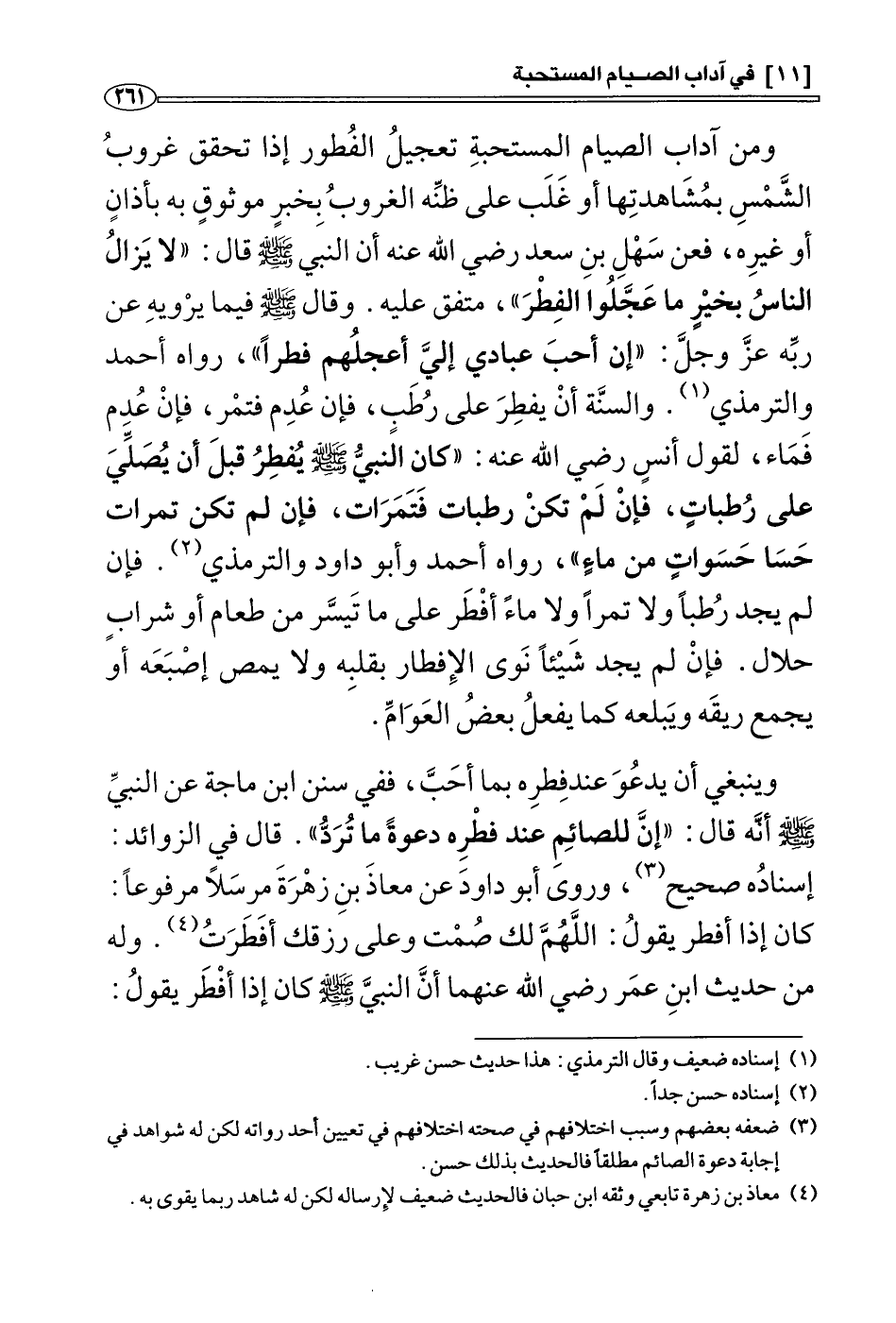 ومن آداب الصيام المستحبة تعجيل الفطور إذا تحقق غروب الشمس بمشاهدتها أو غلب على ظنه الغروب بخبر موثوق به بأذان أو غيره، فعن سهل بن سعد رضي الله عنه أن النبي صَلَّى اللَّهُ عَلَيْهِ وَسَلَّمَ قال: «لا يزال الناس بخير ما عَجَّلوا الفطر» (¬1) ، وقال صَلَّى اللَّهُ عَلَيْهِ وَسَلَّمَ فيما يرويه عن ربه عز وجل: «إن أحب عبادي إلي أعجلهم فطرا» (¬2) ، والسنة أن يفطر على رطب، فإن عُدِم فتمر، فإن عدم فماء، لقول أنس رضي الله عنه: «كان النبي صَلَّى اللَّهُ عَلَيْهِ وَسَلَّمَ يفطر قبل أن يصلي على رطبات، فإن لم تكن رطبات فتمرات، فإن لم تكن تمرات حسا حسوات من ماء» (¬3) ، فإن لم يجد رطبا ولا تمرا ولا ماء أفطر على ما تيسَّر من طعام أو شراب حلال، فإن لم يجد شيئا نوى الإفطار بقلبه، ولا يمص إصبعه أو يجمع ريقه ويبلعه كما يفعل بعض العوام.