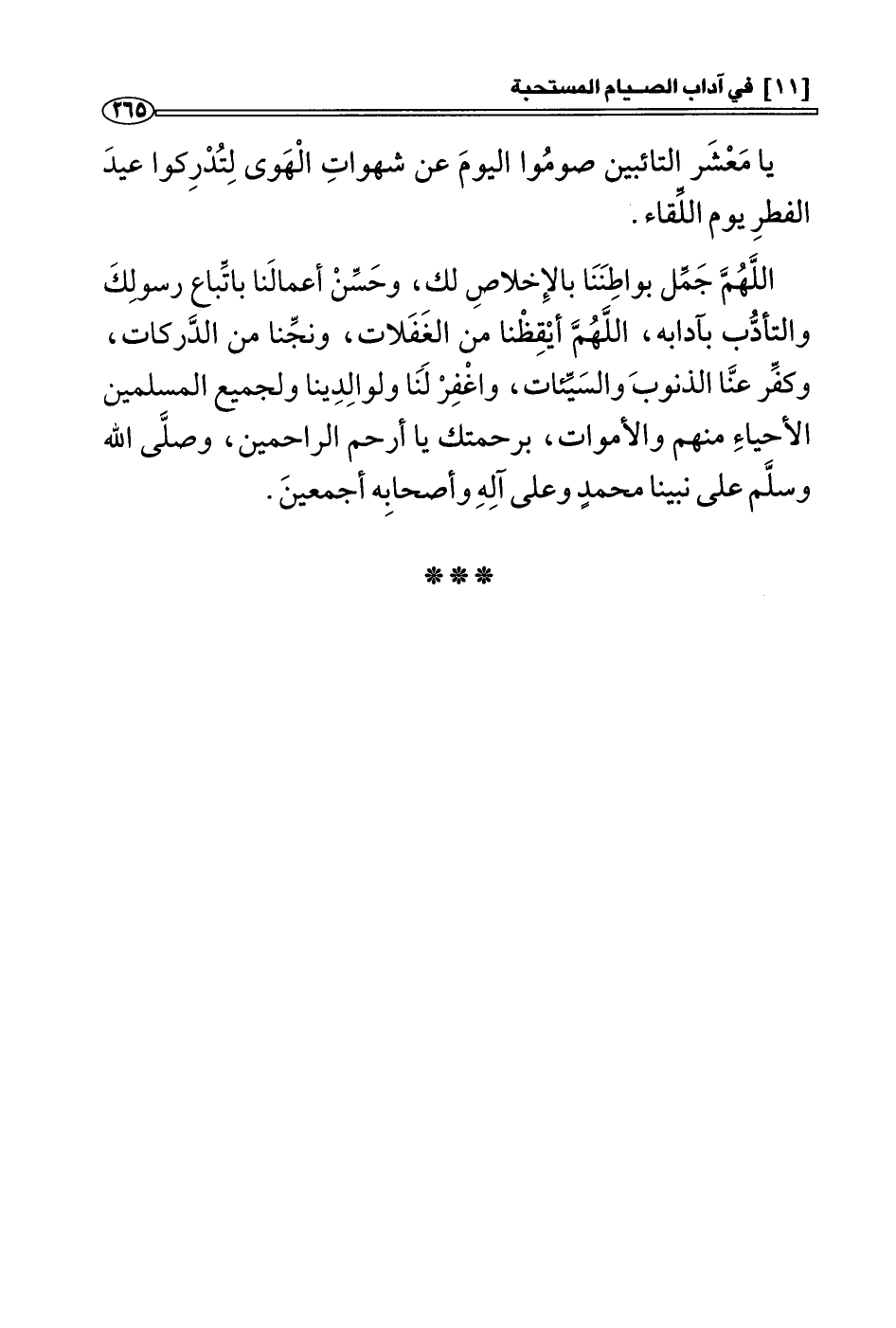 اللهم جَمِّل بواطننا بالإخلاص لك، وحَسِّن أعمالنا باتباع رسولك والتأدب بآدابه، اللهم أيقظنا من الغفلات، ونَجِّنَا من الدركات، وكفر عنا الذنوب والسيئات، واغفر لنا ولوالدينا ولجميع المسلمين الأحياء منهم والأموات، برحمتك يا أرحم الراحمين، وصلى الله وسلم على نبينا محمد وعلى آله وأصحابه أجمعين.