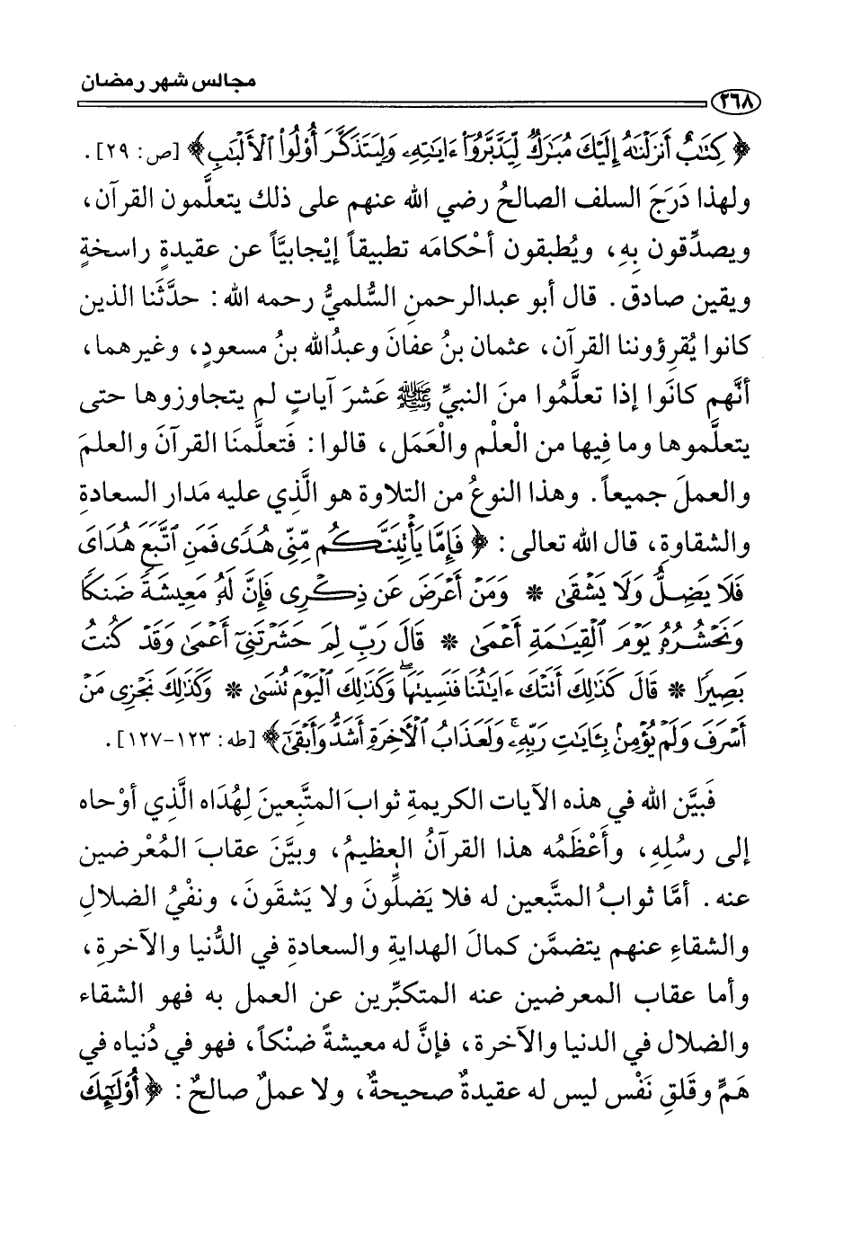 وهذا النوع من التلاوة هو الذي عليه مدار السعادة والشقاوة , قال الله تعالى: {قَالَ اهْبِطَا مِنْهَا جَمِيعًا بَعْضُكُمْ لِبَعْضٍ عَدُوٌّ فَإِمَّا يَأْتِيَنَّكُمْ مِنِّي هُدًى فَمَنِ اتَّبَعَ هُدَايَ فَلَا يَضِلُّ وَلَا يَشْقَى} {وَمَنْ أَعْرَضَ عَنْ ذِكْرِي فَإِنَّ لَهُ مَعِيشَةً ضَنْكًا وَنَحْشُرُهُ يَوْمَ الْقِيَامَةِ أَعْمَى} {قَالَ رَبِّ لِمَ حَشَرْتَنِي أَعْمَى وَقَدْ كُنْتُ بَصِيرًا} {قَالَ كَذَلِكَ أَتَتْكَ آيَاتُنَا فَنَسِيتَهَا وَكَذَلِكَ الْيَوْمَ تُنْسَى} {وَكَذَلِكَ نَجْزِي مَنْ أَسْرَفَ وَلَمْ يُؤْمِنْ بِآيَاتِ رَبِّهِ وَلَعَذَابُ الْآخِرَةِ أَشَدُّ وَأَبْقَى} [طه: 123 - 127] ، فبَيَّنَ الله في هذه الآيات الكريمة ثواب المتَّبِعين لهداه الذي أوحاه إلى رسله، وأعظمه هذا القرآن العظيم، وبيَّن عقاب المعرضين عنه.