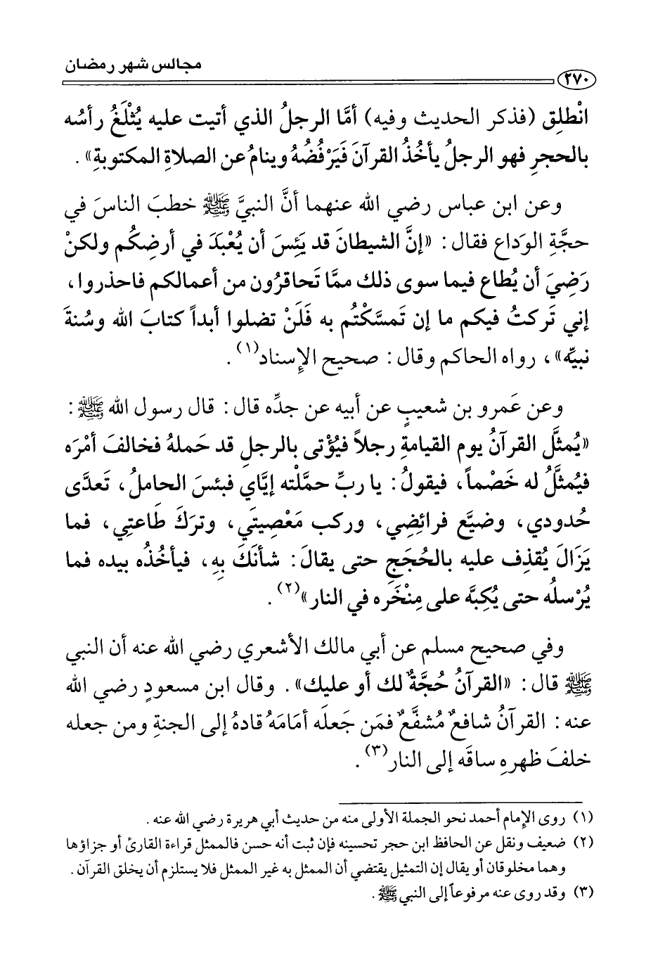 وعن ابن عباس رضي الله عنهما «أن النبي صَلَّى اللَّهُ عَلَيْهِ وَسَلَّمَ خطب الناس في حجة الوداع فقال: " إن الشيطان قد يئس أن يُعْبَد في أرضكم ولكن رضي أن يُطَاع فيما سوى ذلك مما تَحاقرون من أعمالكم فاحذروا، إني تركت فيكم ما إن تمسكتم به فلن تضلوا أبدا: كتاب الله وسنة نبيه» (¬2) ، وعن عمرو بن شعيب عن أبيه عن جده قال: قال رسول الله صَلَّى اللَّهُ عَلَيْهِ وَسَلَّمَ: «يُمَثَّل القرآن يوم القيامة رجلا فيُؤْتَى بالرجل قد حمله فخالف أمره فيُمَثَّل له خصما فيقول: يا رب حَمَّلته إياي فبئس الحامل تعدَّى حدودي، وضيع فرائضي , وركب معصيتي , وترك طاعتي , فما يزال يقذف عليه بالحجج حتى يقال: شأنك به , فيأخذه بيده فما يرسله حتى يكبه على منخره في النار» (¬3) ، وعن أبي مالك الأشعري رضي الله عنه أن النبي صَلَّى اللَّهُ عَلَيْهِ وَسَلَّمَ قال: «القرآن حجة لك أو عليك» (¬4) ، وقال ابن مسعود رضي الله عنه: القرآن شافع مُشفَّع، فمن جعله أمامه قاده إلى الجنة، ومن جعله خلف ظهره ساقه إلى النار (¬5) .