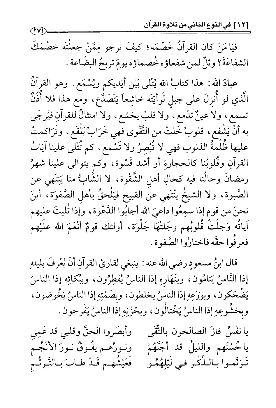 قال ابن مسعود رضي الله عنه: ينبغي لقارئ القرآن أن يُعْرَف بليله إذ الناس ينامون , وبنهاره إذ الناس يُفْطِرون , وببكائه إذ الناس يضحكون , وبورعه إذ الناس يخلطون، وبصمته إذ الناس يخوضون , وبخشوعه إذ الناس يختالون , وبحزنه إذ الناس يفرحون.