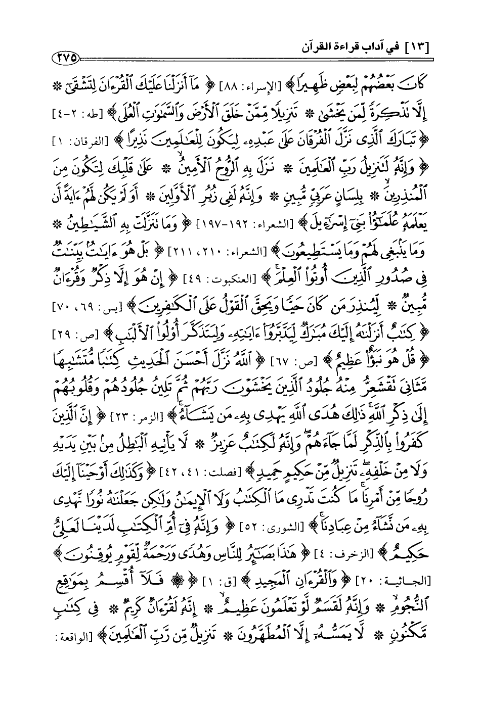 {تَبَارَكَ الَّذِي نَزَّلَ الْفُرْقَانَ عَلَى عَبْدِهِ لِيَكُونَ لِلْعَالَمِينَ نَذِيرًا} [الفرقان: 1] ، {وَإِنَّهُ لَتَنْزِيلُ رَبِّ الْعَالَمِينَ} {نَزَلَ بِهِ الرُّوحُ الْأَمِينُ} {عَلَى قَلْبِكَ لِتَكُونَ مِنَ الْمُنْذِرِينَ} {بِلِسَانٍ عَرَبِيٍّ مُبِينٍ} {وَإِنَّهُ لَفِي زُبُرِ الْأَوَّلِينَ} {أَوَلَمْ يَكُنْ لَهُمْ آيَةً أَنْ يَعْلَمَهُ عُلَمَاءُ بَنِي إِسْرَائِيلَ} [الشعراء: 192 - 197] ، {وَمَا تَنَزَّلَتْ بِهِ الشَّيَاطِينُ} {وَمَا يَنْبَغِي لَهُمْ وَمَا يَسْتَطِيعُونَ} [الشعراء: 210 - 211] ، {بَلْ هُوَ آيَاتٌ بَيِّنَاتٌ فِي صُدُورِ الَّذِينَ أُوتُوا الْعِلْمَ} [العنكبوت: 49] ، {إِنْ هُوَ إِلَّا ذِكْرٌ وَقُرْآنٌ مُبِينٌ} {لِيُنْذِرَ مَنْ كَانَ حَيًّا وَيَحِقَّ الْقَوْلُ عَلَى الْكَافِرِينَ} [يس: 69 - 70] ، {كِتَابٌ أَنْزَلْنَاهُ إِلَيْكَ مُبَارَكٌ لِيَدَّبَّرُوا آيَاتِهِ وَلِيَتَذَكَّرَ أُولُو الْأَلْبَابِ} [ص: 29] .