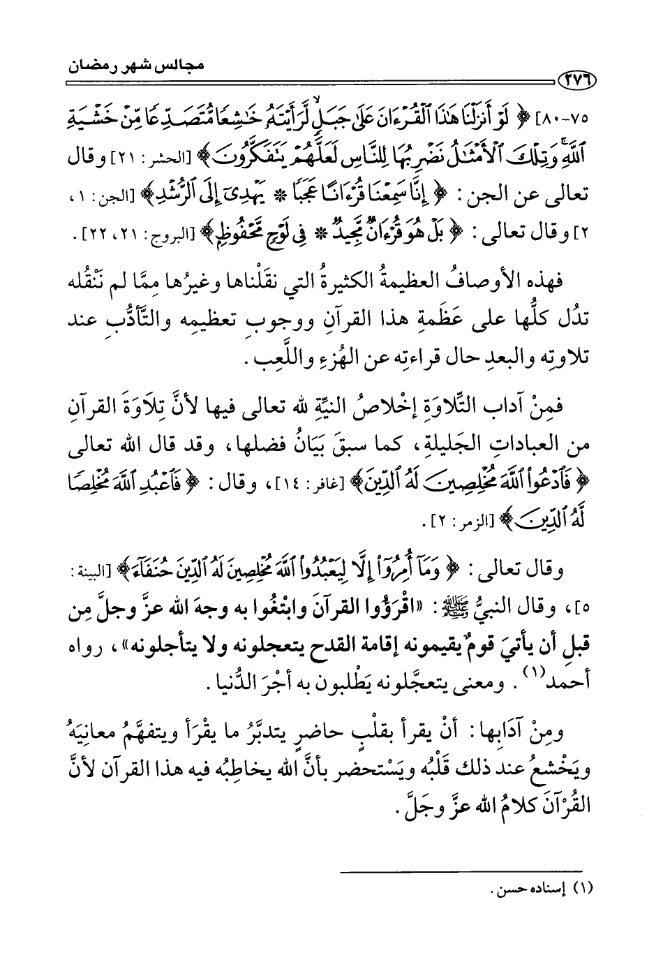 فمن آداب التلاوة إخلاص النية لله تعالى فيها؛ لأن تلاوة القرآن من العبادات الجليلة كما سبق بيان فضلها، وقد قال الله تعالى: {فَادْعُوا اللهَ مُخْلِصِينَ لَهُ الدِّينَ} [غافر: 14] ، وقال تعالى: {وَمَا أُمِرُوا إِلَّا لِيَعْبُدُوا اللهَ مُخْلِصِينَ لَهُ الدِّينَ حُنَفَاءَ} [البينة: 5] ، وقال النبي صَلَّى اللَّهُ عَلَيْهِ وَسَلَّمَ: «اقرءوا القرآن وابتغوا به وجه الله عز وجل من قبل أن يأتي قوم يقيمونه إقامة القدح يتعجلونه ولا يتأجلونه» (¬1) ، ومعنى يتعجلونه يطلبون به أجر الدنيا.
