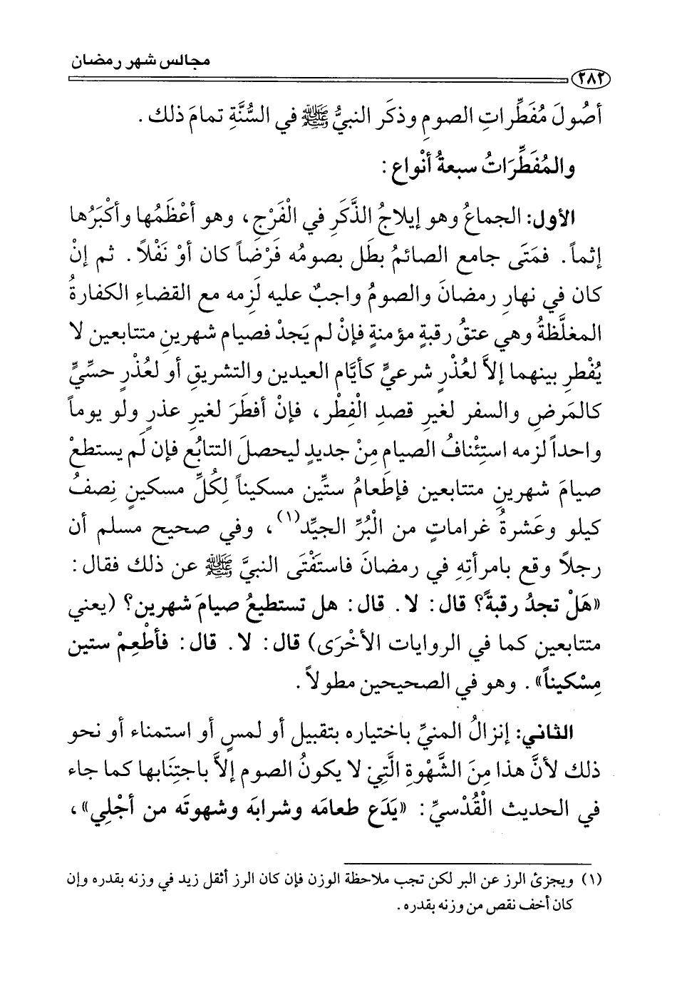 * الأول: الجماع وهو إيلاج الذكر في الفرج، وهو أعظمها وأكبرها إثما , فمتى جامع الصائم بطل صومه فرضا كان أو نفلا، ثم إن كان في نهار رمضان والصوم واجب عليه لزمه مع القضاء الكفّارة المغلّظة، وهي عتق رقبة مؤمنة، فإن لم يجد فصيام شهرين متتابعين لا يفطر بينهما إلا لعذر شرعي كأيام العيدين والتشريق , أو لعذر حسي كالمرض والسفر لغير قصد الفطر , فإن أفطر لغير عذر ولو يوما واحدا لزمه استئناف الصيام من جديد ليحصل التتابع، فإن لم يستطع صيام شهرين متتابعين فإطعام ستين مسكينا، لكل مسكين نصف كيلو وعشرة غرامات من البُرّ الجيد ويجزي الرز عن البر لكن تجب ملاحظة الوزن، فإن كان الرز أثقل زِيدَ في وزنه بقدره، وإن كان أخف نقص من وزنه بقدر. وفي الحديث: «أن رجلا وقع بامرأته في رمضان فاستفتى النبي صَلَّى اللَّهُ عَلَيْهِ وَسَلَّمَ عن ذلك فقال: " هل تجد رقبة؟ " قال: لا. قال: هل تستطيع صيام شهرين؟» (يعني متتابعين كما في الروايات الأخرى) ، «قال: لا. قال: " فأطعم ستين مسكينا» (¬1) ، وهو في الصحيحين مطَوَّلا.