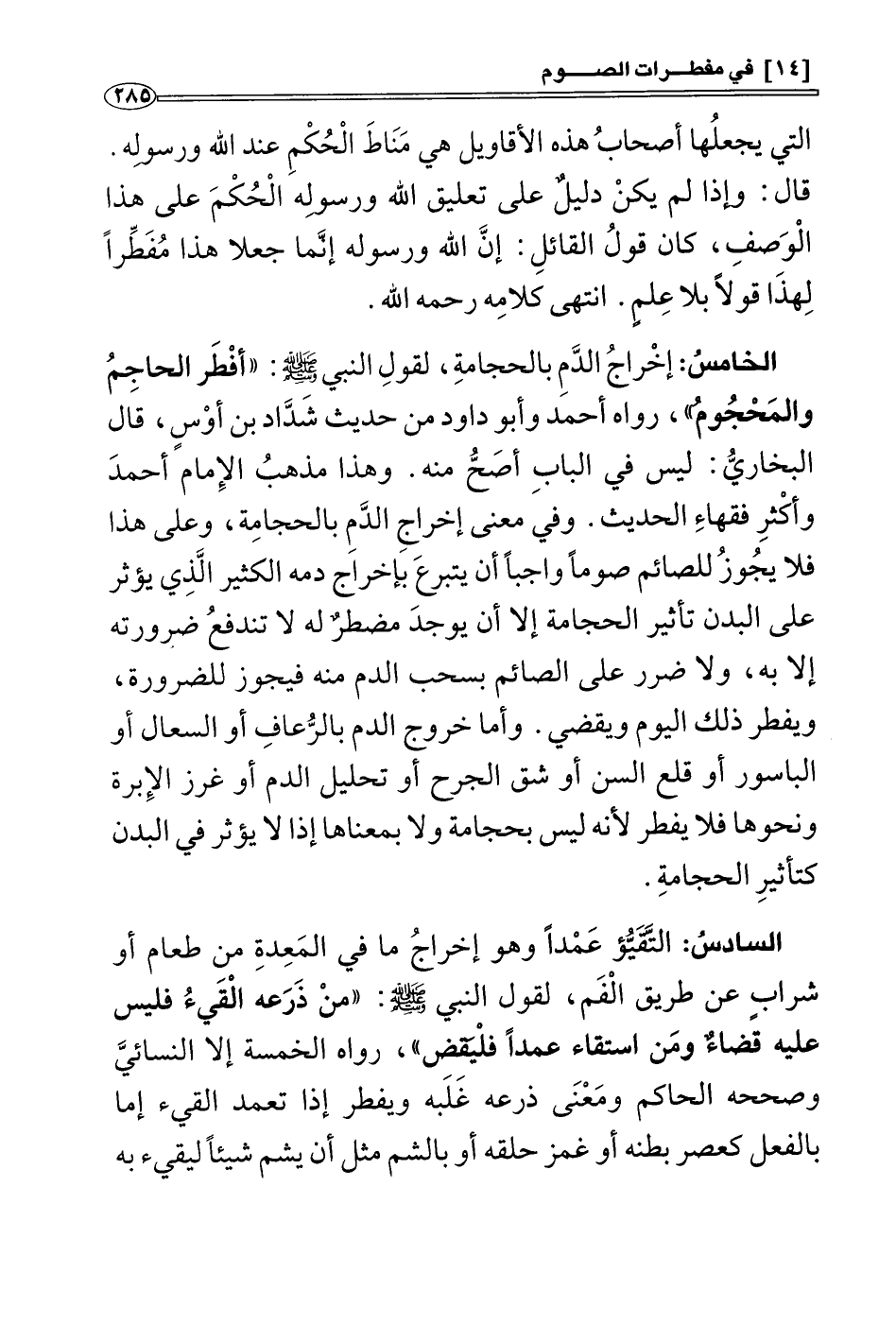 * النوع الخامس: إخراج الدم بالحجامة , لقول النبي صَلَّى اللَّهُ عَلَيْهِ وَسَلَّمَ: «أَفْطَرَ الحاجم والمحجوم» (¬1) ، وهذا مذهب الإمام أحمد وأكثر فقهاء الحديث، وفي معنى إخراج الدم بالحجامة إخراجه بالفصد ونحوه مما يُؤَثِّر على البدن كتأثير الحجامة , وعلى هذا فلا يجوز للصائم صوما واجبا أن يتبرع بإخراج دمه الكثير الذي يؤثر على البدن تأثير الحجامة إلا أن يوجد مضطر له لا تندفع ضرورته إلا به، ولا ضرر على الصائم بسحب الدم منه فيجوز للضرورة ويفطر ذلك اليوم ويقضي، وأما خروج الدم بالرعاف أو السعال أو الباسور أو قلع السن أو شق الجرح أو تحليل الدم أو غرز الإبرة ونحوها فلا يفطر لأنه ليس بحجامة ولا بمعناها إذ لا يؤثر في البدن كتأثير الحجامة.