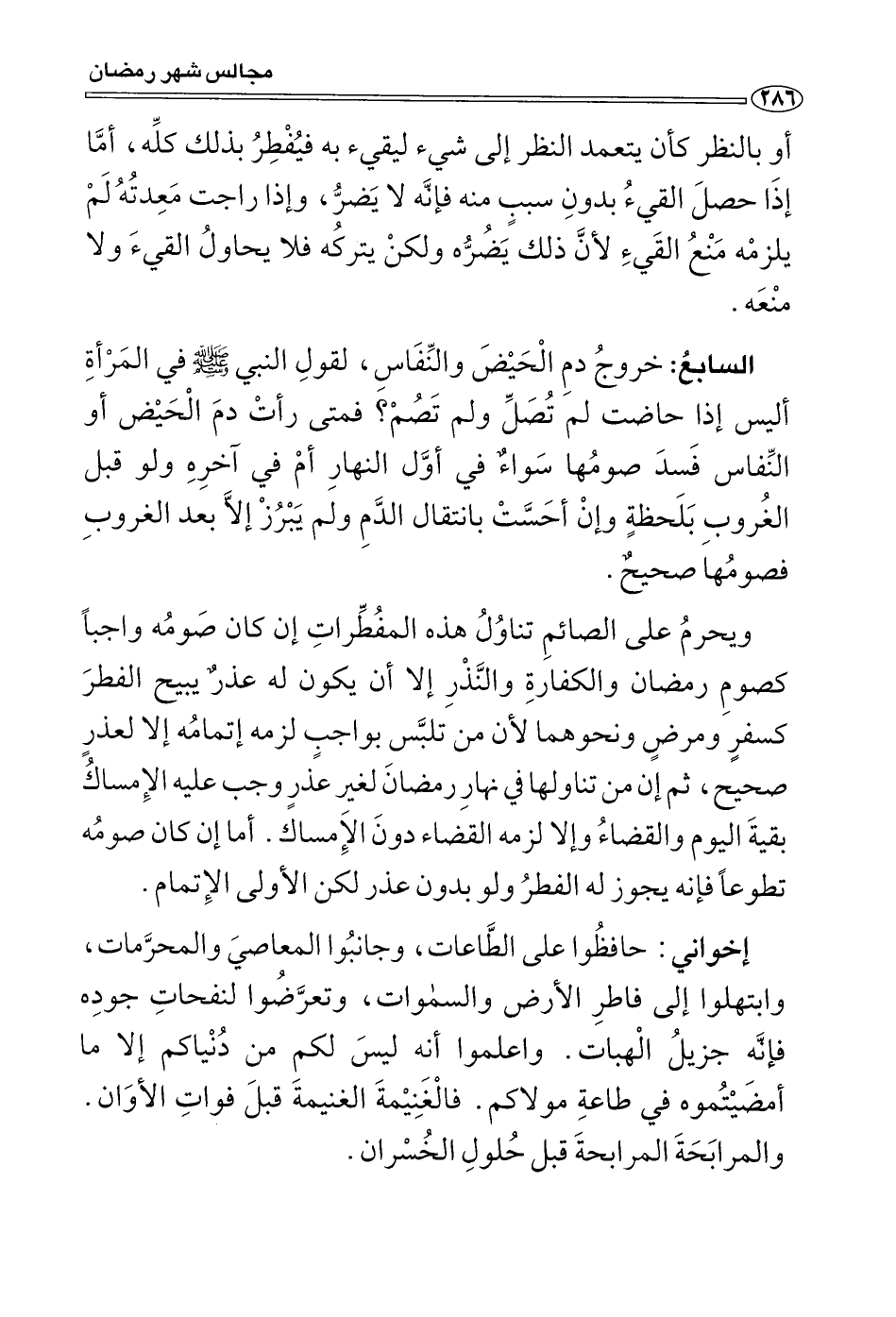 * السابع: خروج دم الحيض والنفاس، لقول النبي صَلَّى اللَّهُ عَلَيْهِ وَسَلَّمَ في المرأة: «أليس إذا حاضت لم تُصَلِّ ولم تَصُمْ؟» ، فمتى رأت دم الحيض أو النفاس فسد صومها سواء في أول النهار أم في آخره ولو قبل الغروب بلحظة , وإن أحست بانتقال الدم ولم يبرز إلا بعد الغروب فصومها صحيح.