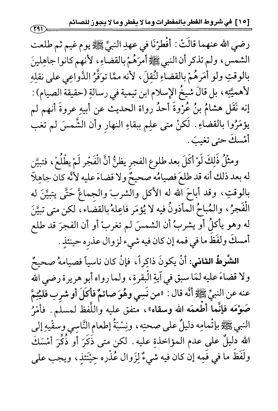 * الشرط الثاني: أن يكون ذاكرا , فإن كان ناسيا فصيامه صحيح ولا قضاء عليه لما سبق في آية البقرة , ولما رواه أبو هريرة رضي الله عنه عن النبي صَلَّى اللَّهُ عَلَيْهِ وَسَلَّمَ أنه قال: «من نسي وهو صائم فأكل أو شرب فليتم صومه فإنما أطعمه الله وسقاه» (¬2) ، فَأَمْرُ النبيِّ صَلَّى اللَّهُ عَلَيْهِ وَسَلَّمَ بإتمامه دليل على صحته، ونسبة إطعام الناسي وسقيه إلى الله دليل على عدم المؤاخذة عليه، لكن متى ذَكَرَ أو ذُكِّرَ أمسك ولفظ ما في فمه إن كان فيه شيء لزوال عذره حينئذ , ويجب على