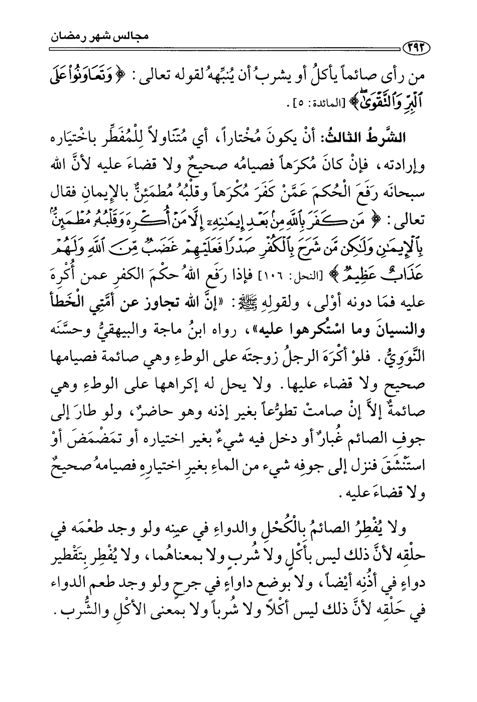 * الشرط الثالث: أن يكون مختارا، أي: متناولا للمفطر باختياره وإرادته، فإن كان مكرها فصيامه صحيح ولا قضاء عليه؛ لأن الله سبحانه رفع الحكم عمن كفر مكرها وقلبه مطمئن بالإيمان فقال تعالى: {مَنْ كَفَرَ بِاللهِ مِنْ بَعْدِ إِيمَانِهِ إِلَّا مَنْ أُكْرِهَ وَقَلْبُهُ مُطْمَئِنٌّ بِالْإِيمَانِ وَلَكِنْ مَنْ شَرَحَ بِالْكُفْرِ صَدْرًا فَعَلَيْهِمْ غَضَبٌ مِنَ اللهِ وَلَهُمْ عَذَابٌ عَظِيمٌ} [النحل: 106] ، فإذا رفع الله حكم الكفر عمن أكره عليه فما دونه أولى، ولقوله صَلَّى اللَّهُ عَلَيْهِ وَسَلَّمَ: «إن الله تجاوز عن أمتي الخطأ والنسيان وما استكرهوا عليه» (¬1) ، فلو أكره الرجل زوجته على الوطء وهي صائمة فصيامها صحيح ولا قضاء عليها، ولا يحل له إكراهها على الوطء وهي صائمة إلا إن صامت تطوعا بغير إذنه وهو حاضر، ولو طار إلى جوف الصائم غبار أو دخل فيه شي من الماء بغير اختياره فصيامه صحيح ولا قضاء عليه.