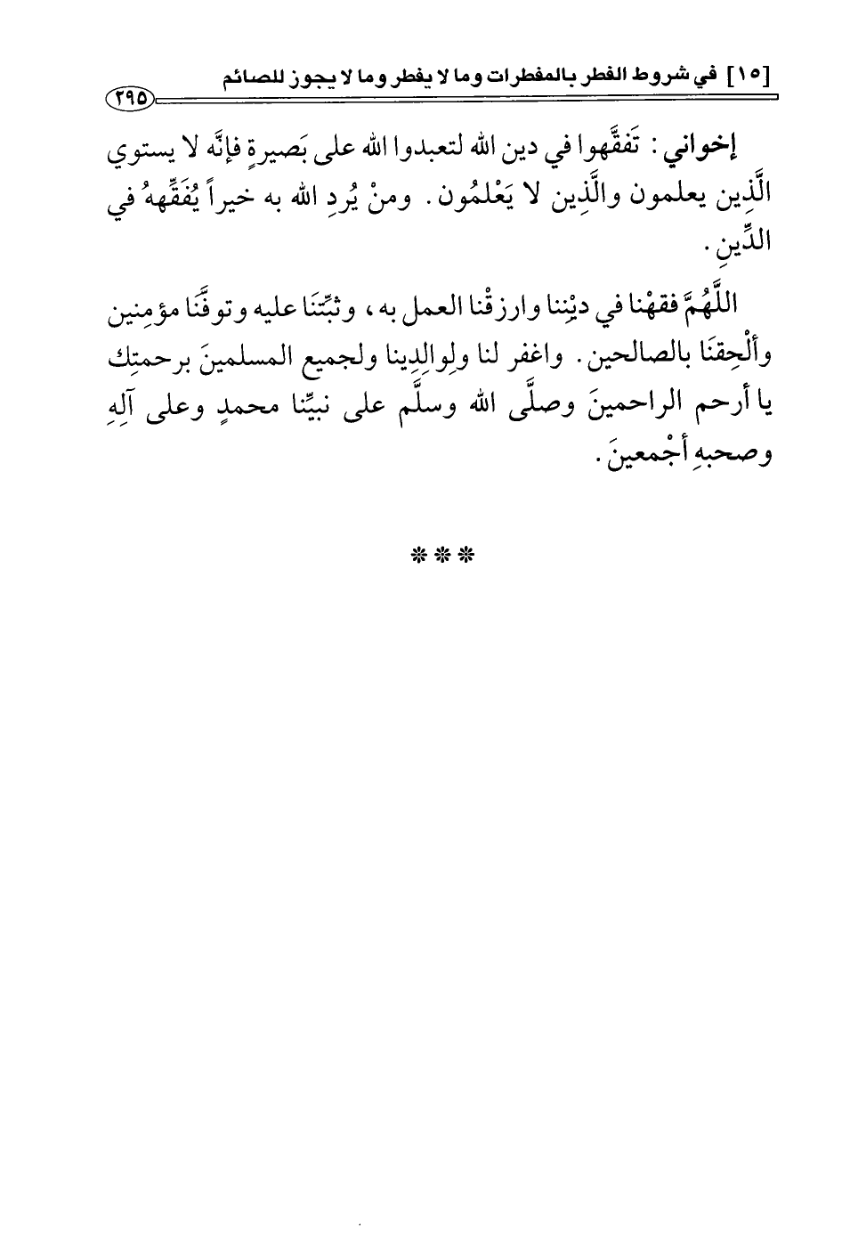 اللهم فَقِّهْنَا في ديننا، وارزقنا العمل به , وثَبِّتْنَا عليه وتَوَفَّنَا مؤمنين، وألحقنا بالصالحين، واغفر لنا ولوالدينا ولجميع المسلمين برحمتك يا أرحم الراحمين، وصلى الله وسلَّم على نبينا محمد وعلى آله وصحبه أجمعين.
