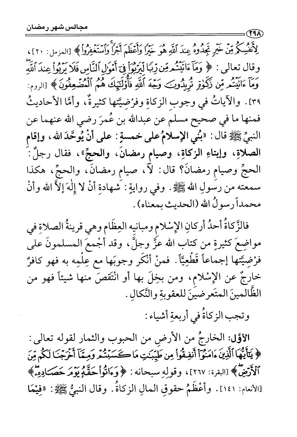 لِأَنْفُسِكُمْ مِنْ خَيْرٍ تَجِدُوهُ عِنْدَ اللهِ هُوَ خَيْرًا وَأَعْظَمَ أَجْرًا} [المزمل: 20] ، وقال تعالى: {وَمَا آتَيْتُمْ مِنْ زَكَاةٍ تُرِيدُونَ وَجْهَ اللهِ فَأُولَئِكَ هُمُ الْمُضْعِفُونَ} [الروم: 39] ، والآيات في وجوب الزكاة وفَرْضِيَّتها كثيرة، وأما الأحاديث فمنها ما رُوِيَ عن عبد الله بن عمر رضي الله عنهما عن النبي صَلَّى اللَّهُ عَلَيْهِ وَسَلَّمَ قال: «بُنِيَ الإسلام على خمس: على أن يُوَحَّدَ اللهُ , وإقام الصلاة , وإيتاء الزكاة , وصيام رمضان , والحج , فقال رجل: الحج وصيام رمضان؟ قال: لا. قال: صيام رمضان والحج» ، هكذا سمعته من رسول الله صَلَّى اللَّهُ عَلَيْهِ وَسَلَّمَ (¬1) . وفي رواية: «شهادة أن لا إله إلا الله وأن محمدا رسول الله» (الحديث بمعناه) .