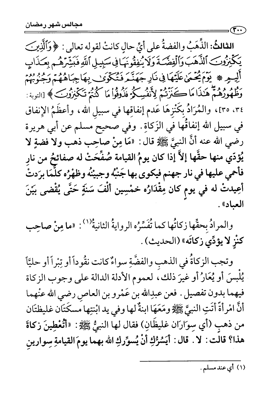 * الثالث: الذهب والفضة على أي حال كانت لقوله تعالى: {وَالَّذِينَ يَكْنِزُونَ الذَّهَبَ وَالْفِضَّةَ وَلَا يُنْفِقُونَهَا فِي سَبِيلِ اللهِ فَبَشِّرْهُمْ بِعَذَابٍ أَلِيمٍ} {يَوْمَ يُحْمَى عَلَيْهَا فِي نَارِ جَهَنَّمَ فَتُكْوَى بِهَا جِبَاهُهُمْ وَجُنُوبُهُمْ وَظُهُورُهُمْ هَذَا مَا كَنَزْتُمْ لِأَنْفُسِكُمْ فَذُوقُوا مَا كُنْتُمْ تَكْنِزُونَ} [التوبة: 34 - 35] ، والمراد بكنزها عدم إنفاقها في سبيل الله، وأعظم الإنفاق في سبيل الله إنفاقها في الزكاة، وعن أبي هريرة رضي الله عنه: أن النبي صَلَّى اللَّهُ عَلَيْهِ وَسَلَّمَ قال: «ما من صاحب ذهب ولا فضة لا يؤدي منها حقها إلا إذا كان يوم القيامة صُفِّحَت له صفائح من نار فأُحْمِيَ عليها في نار جهنم، فيُكْوَى بها جنبه وجبينه وظهره، كلما بردت أعيدت له في يوم كان مقداره خمسين ألف سنة حتى يُقْضَى بين العباد» (¬1) .