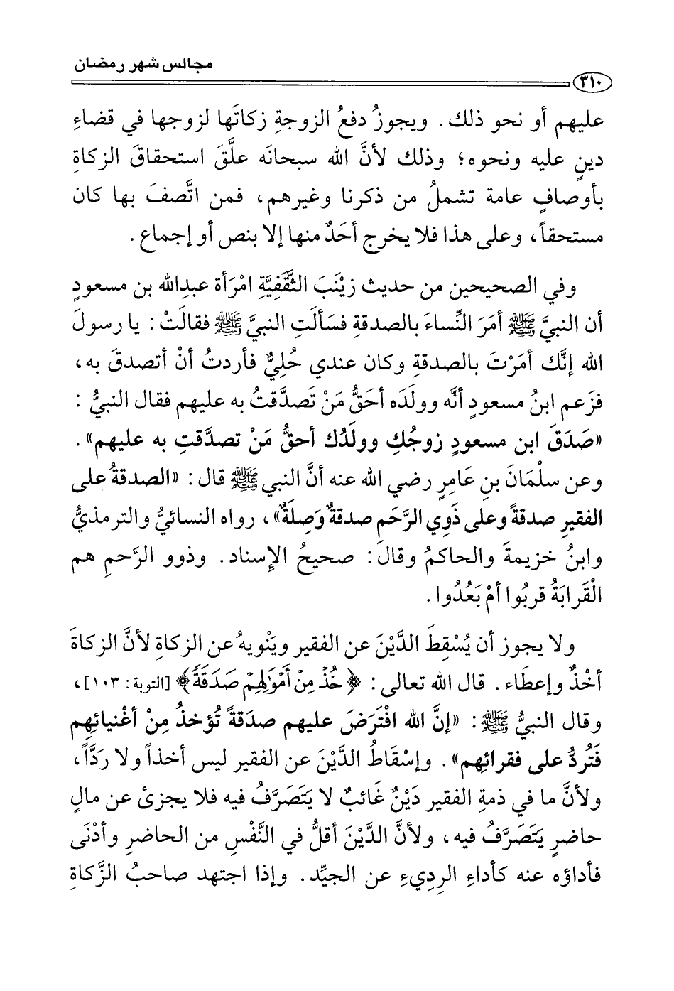 من ذكرنا وغيرهم، فمن اتصف بها كان مستحقا، وعلى هذا فلا يخرج أحد منها إلا بنص أو إجماع، فعن زينب الثقفية امرأة عبد الله بن مسعود «أن النبي صَلَّى اللَّهُ عَلَيْهِ وَسَلَّمَ أمر النساء بالصدقة، فسألت النبي صَلَّى اللَّهُ عَلَيْهِ وَسَلَّمَ فقالت: يا رسول الله إنك أمرت بالصدقة وكان عندي حلي فأردت أن أتصدق به، فزعم ابن مسعود أنه وولده أحق مَنْ تصدَّقْتُ به عليهم، فقال النبي صَلَّى اللَّهُ عَلَيْهِ وَسَلَّمَ: " صدق ابن مسعود زوجك وولدك أحق من تصدقت به عليهم» (¬1) . وعن سلمان بن عامر رضي الله عنه أن النبي صَلَّى اللَّهُ عَلَيْهِ وَسَلَّمَ قال: «الصدقة على الفقير صدقة وعلى ذوي الرحم صدقة وصلة» (¬2) ، وذوو الرحم هم القرابة قربوا أم بعدوا.