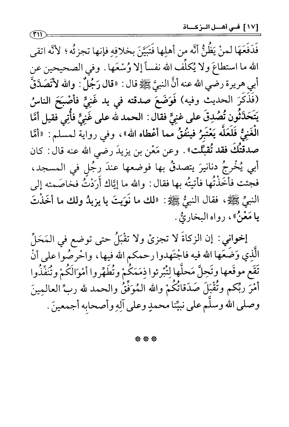 إخواني: إن الزكاة لا تجزئ ولا تُقْبَل حتى توضع في المحل الذي وضعها الله فيه، فاجتهدوا رحمكم الله فيها واحرصوا على أن تقع موقعها وتحل محلها؛ لتُبْرِئوا ذممكم وتُطَهِّروا أموالكم، وتُنَفِّذوا أمر ربكم، وتُقْبَل صدقاتكم، والله الموفِّق، والحمد لله رب العالمين، وصلى الله وسلم على نبينا محمد وعلى آله وأصحابه أجمعين.